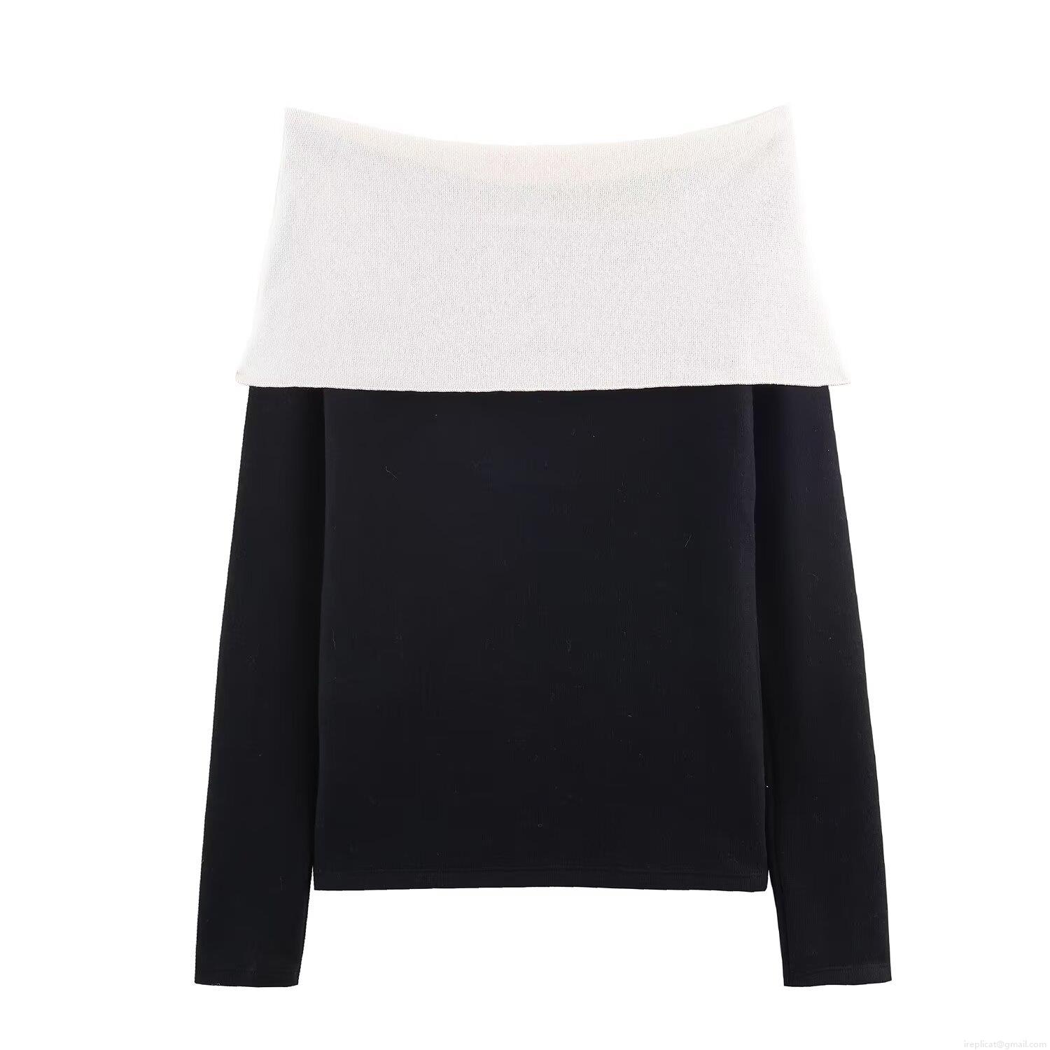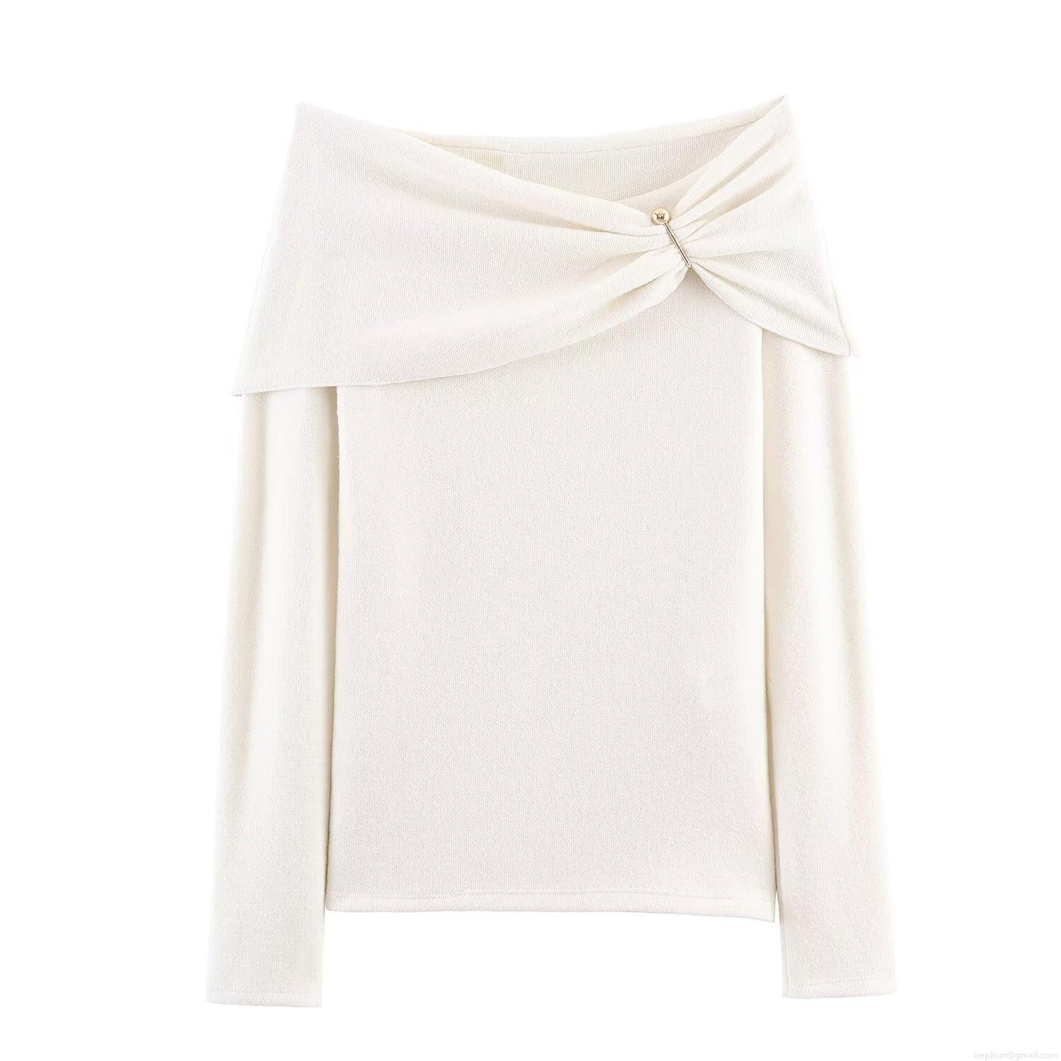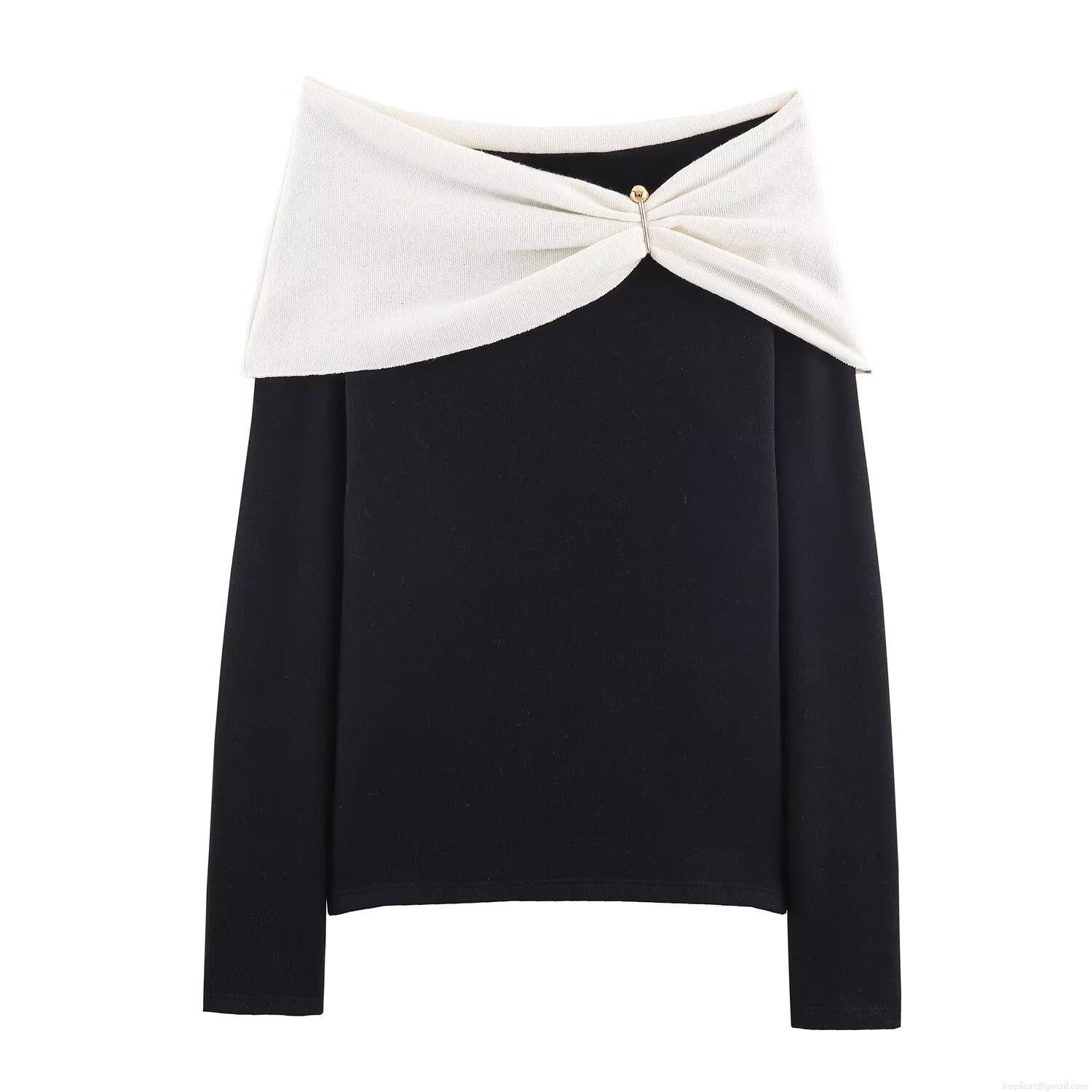 Women's Sexy Off-The-Shoulder Knit Top Long Sleeve Contrast Color Slim Fit T-Shirt With Metal Pin Decoration Elegant Streetwear Blouse Autumn Fashion Casual Shirt