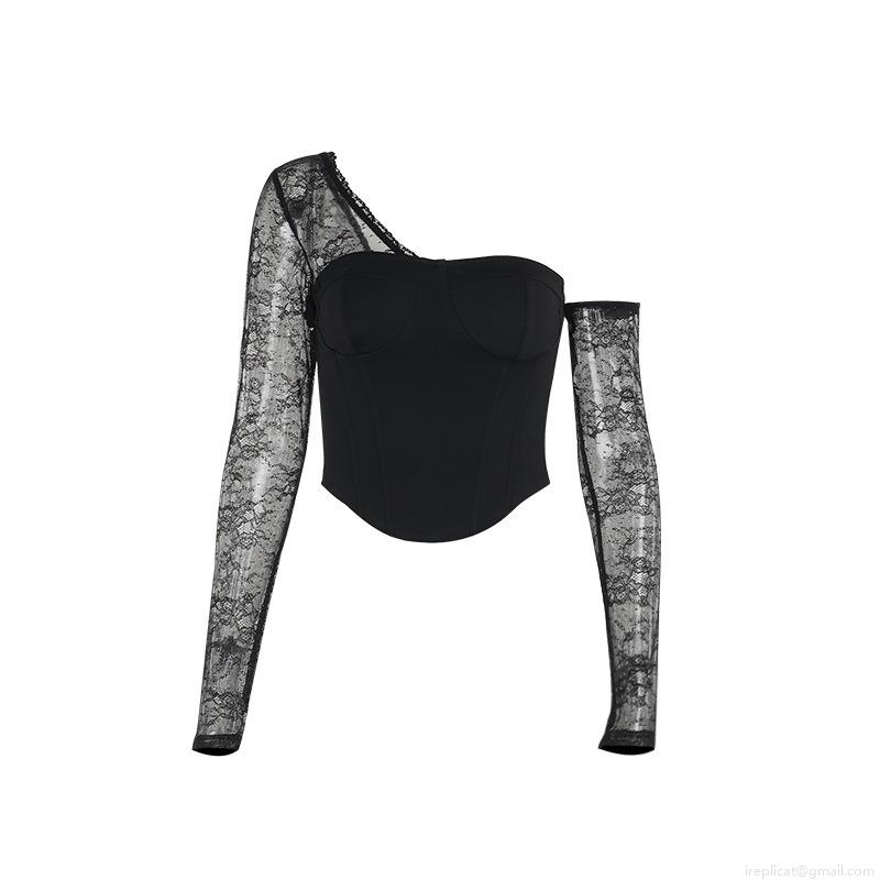 Women's Sexy One Shoulder Lace Patchwork Top Long Sleeve Slim Fit Corset Style T-Shirt Elegant Hollow Out Floral Lace Blouse For Party Clubwear