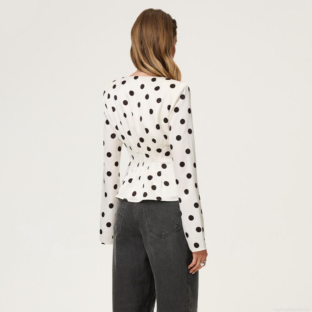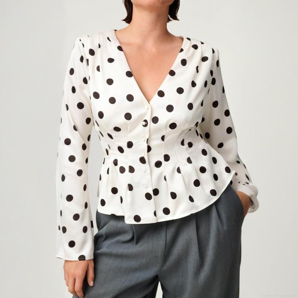 Women's Sexy Polka Dot V-Neck Peplum T-Shirt Long Sleeve Button Down Pleated Slim Fit Blouse Top For Daily Party Streetwear