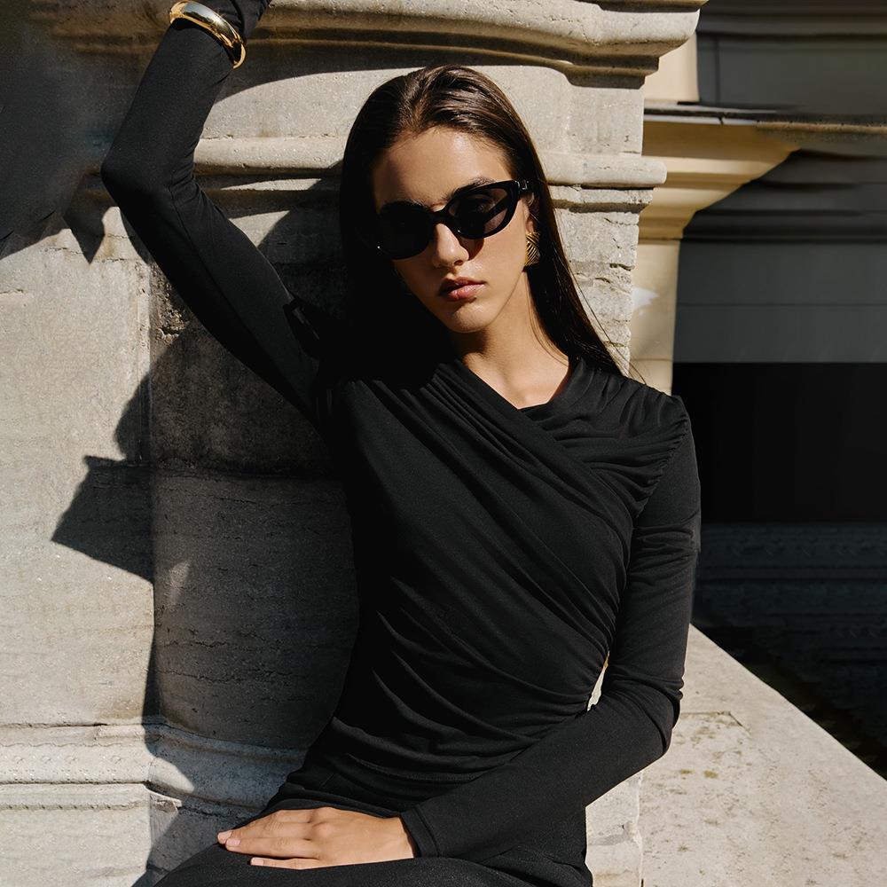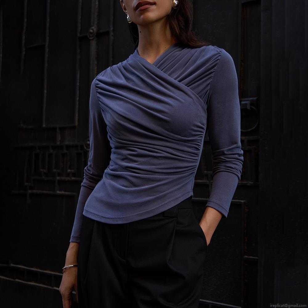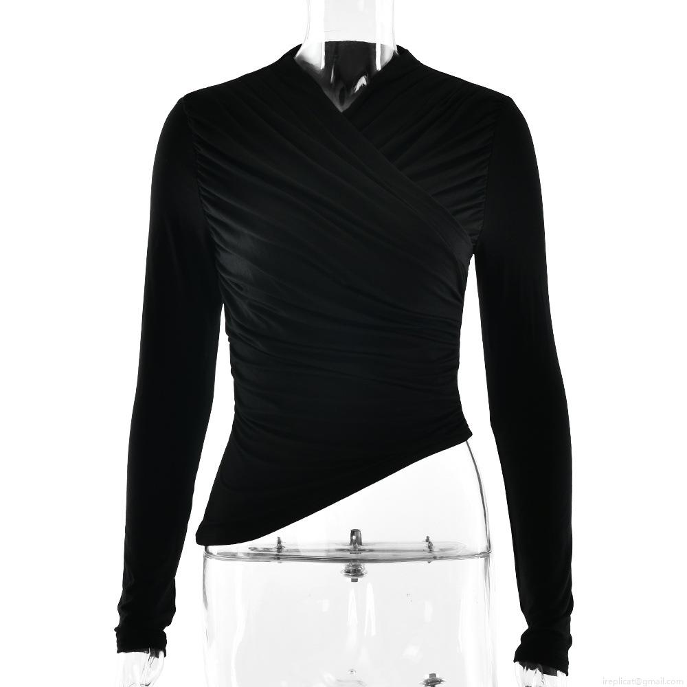 Women's Sexy Ruched V-Neck Slim Fit Long Sleeve T-Shirt Solid Color Modal Fiber Bodycon Top Elegant Asymmetric Hem Streetwear Tee