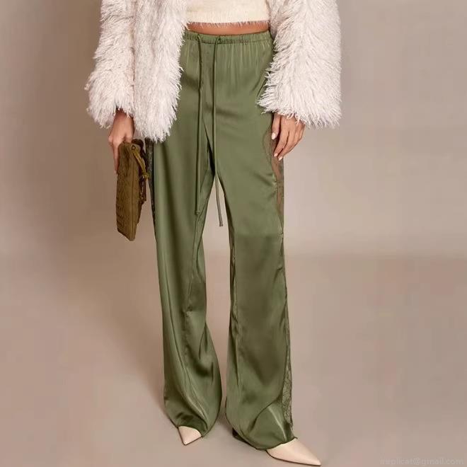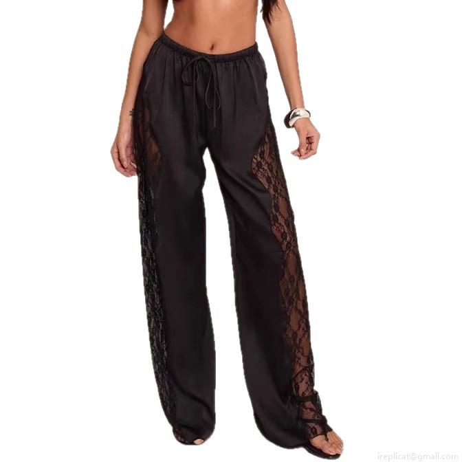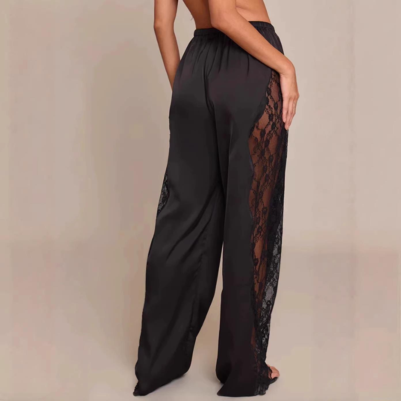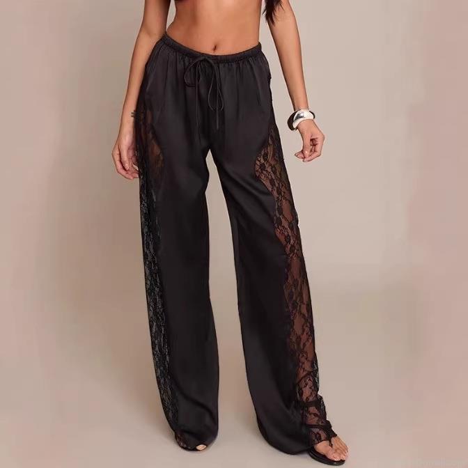 Women's Sexy Satin Lace Patchwork Wide Leg Pants Loose Drawstring Waist Floor Length Trousers Elegant Solid Color Polyester Bottoms For Ladies