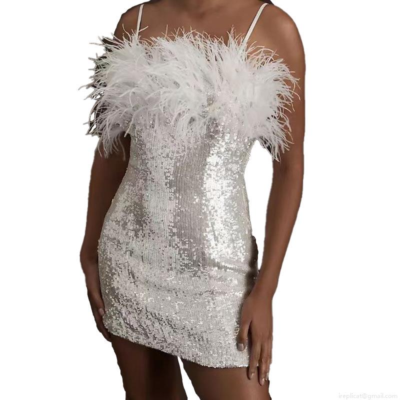 Women's Sexy Sequin Mini Dress With Faux Fur Trim Spaghetti Strap Sleeveless Bodycon Party Dress Polyester Sequined Evening Prom Gown Clubwear