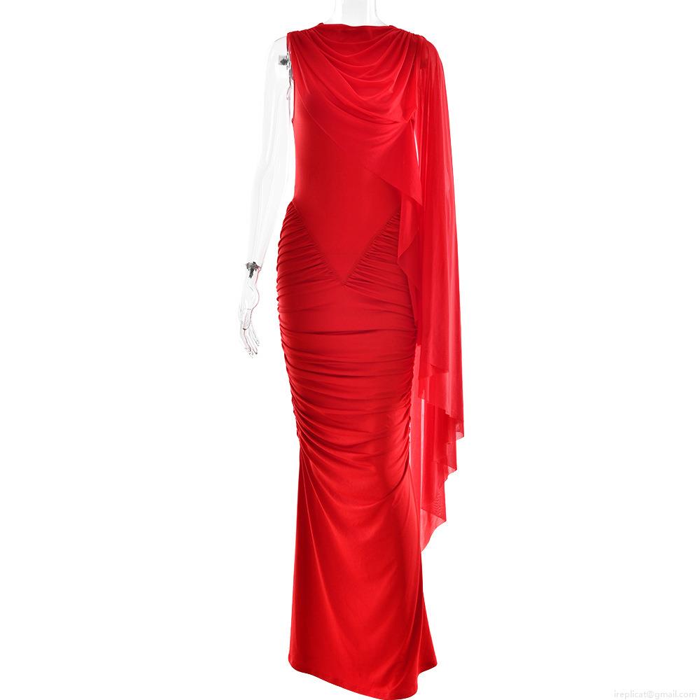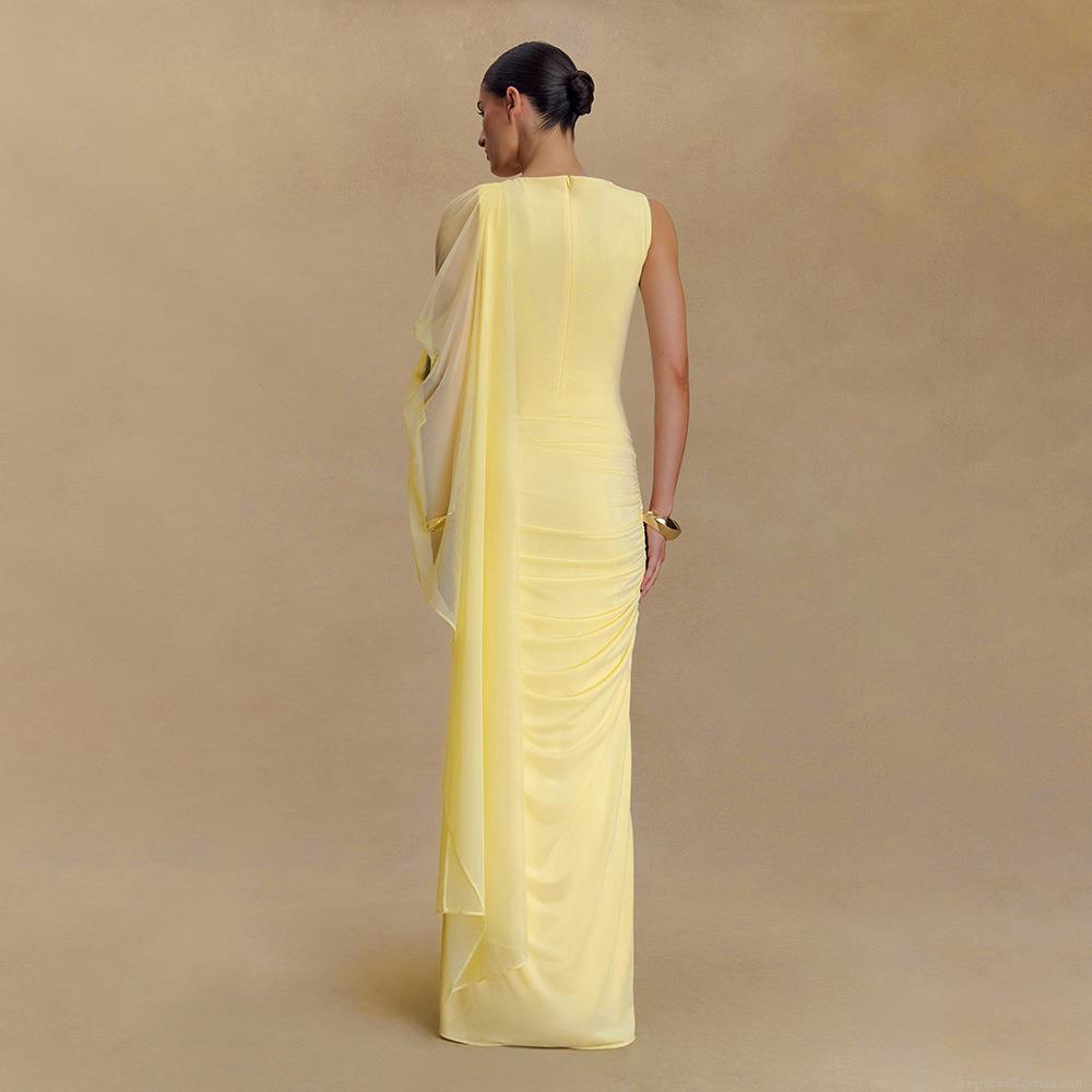 Women's Sexy Slim Fit Ruched Maxi Dress With Mesh One Shoulder Shawl Round Neck Milk Silk Pleated Evening Party Wedding Prom Long Dress