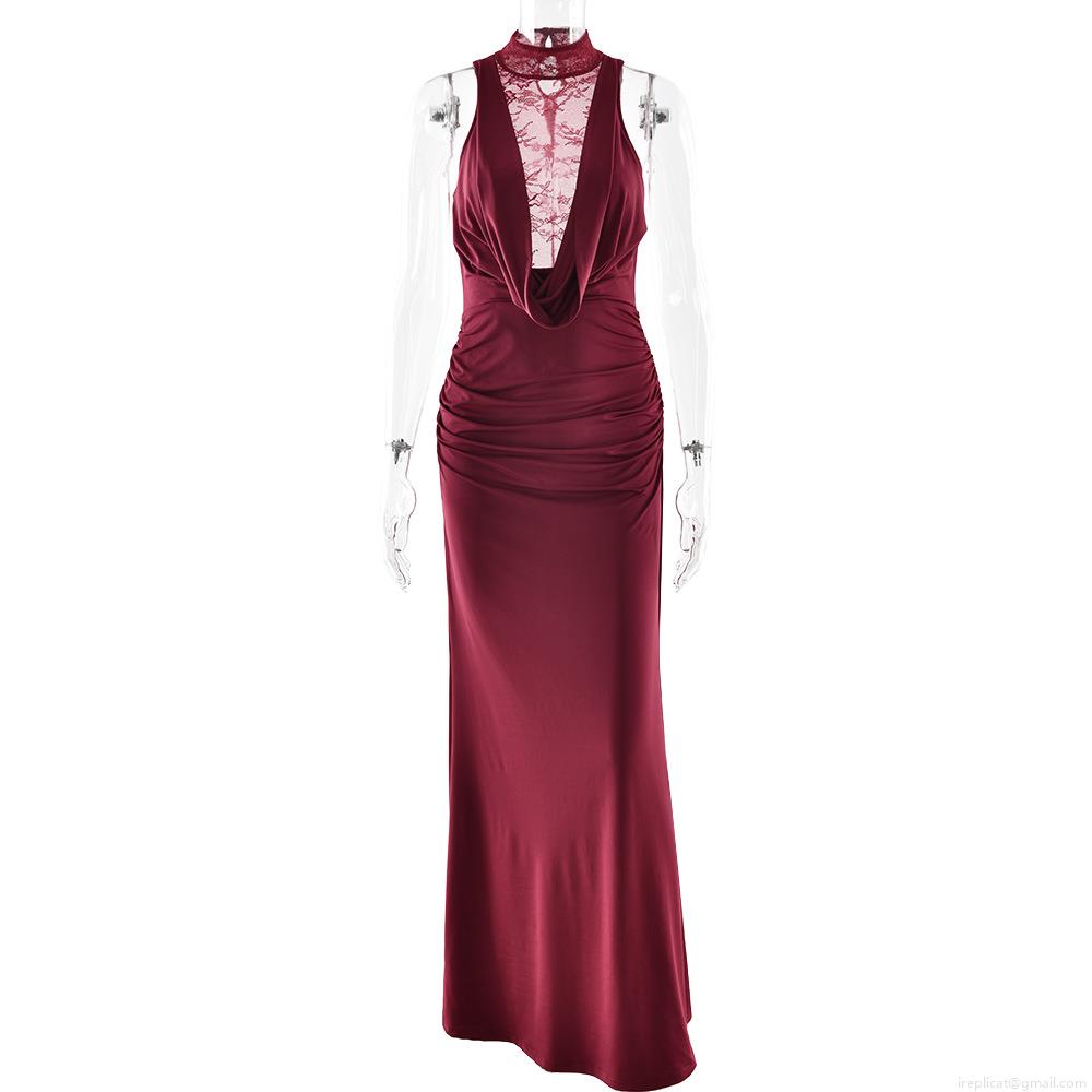 Women's Sexy Splicing Lace Satin Cowl Neck Maxi Dress Pleated Bodycon Evening Party Gown With Lace Gloves Halter Sleeveless Backless Clubwear