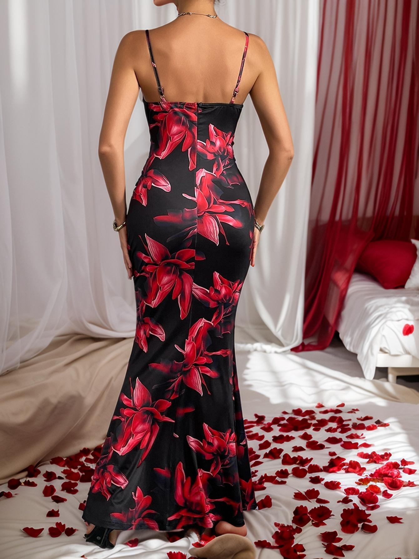 Women's Sexy V Neck Floral Print Backless Cami Maxi Dress Elegant Satin Lace Trim Bodycon Mermaid Evening Party Long Dress