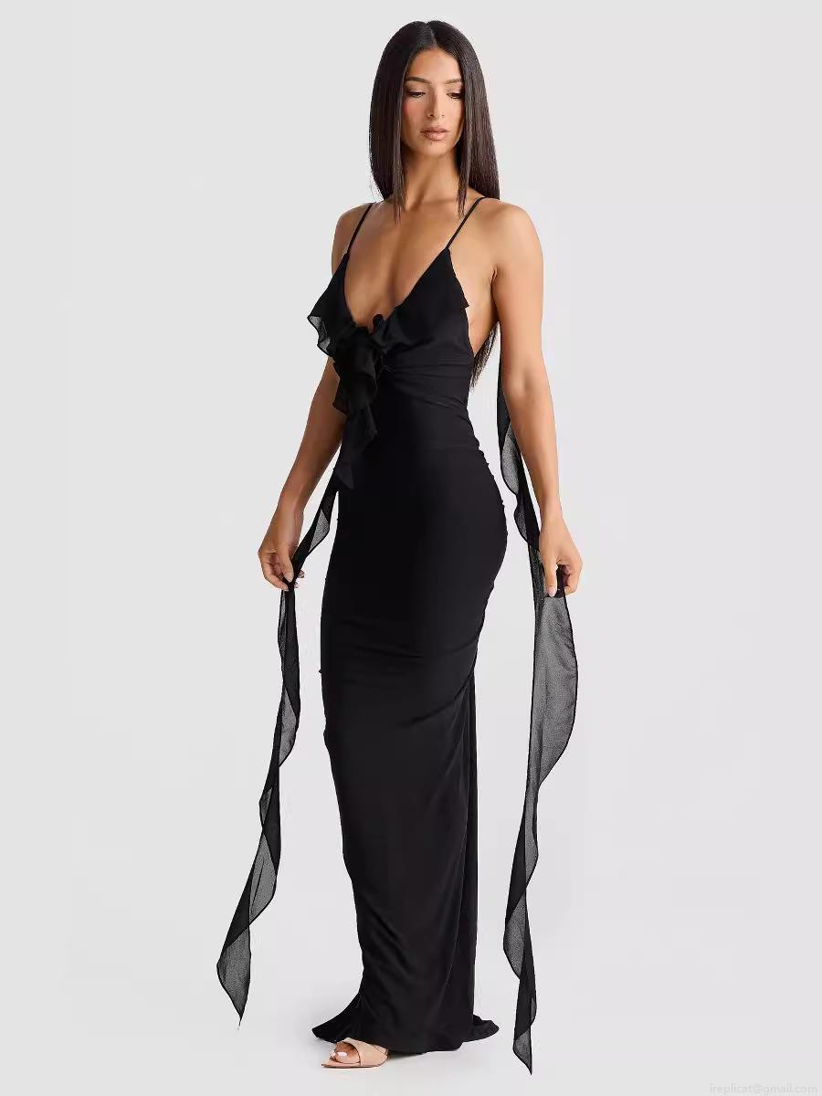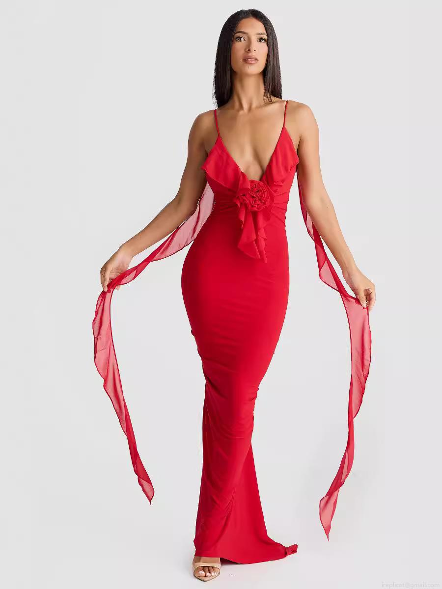 Women's Sexy V-Neck Backless Evening Dress Spaghetti Strap Fishtail Maxi Party Gown With 3D Rose And Long Streamers Elegant Slim Fit Sleeveless Formal Dress For Wedding Banquet Women Clubwear