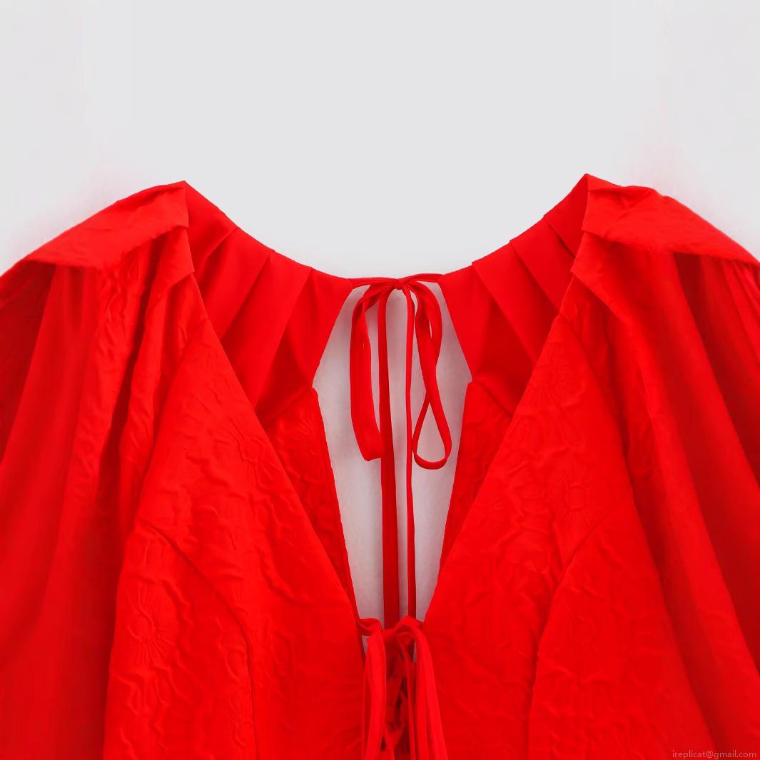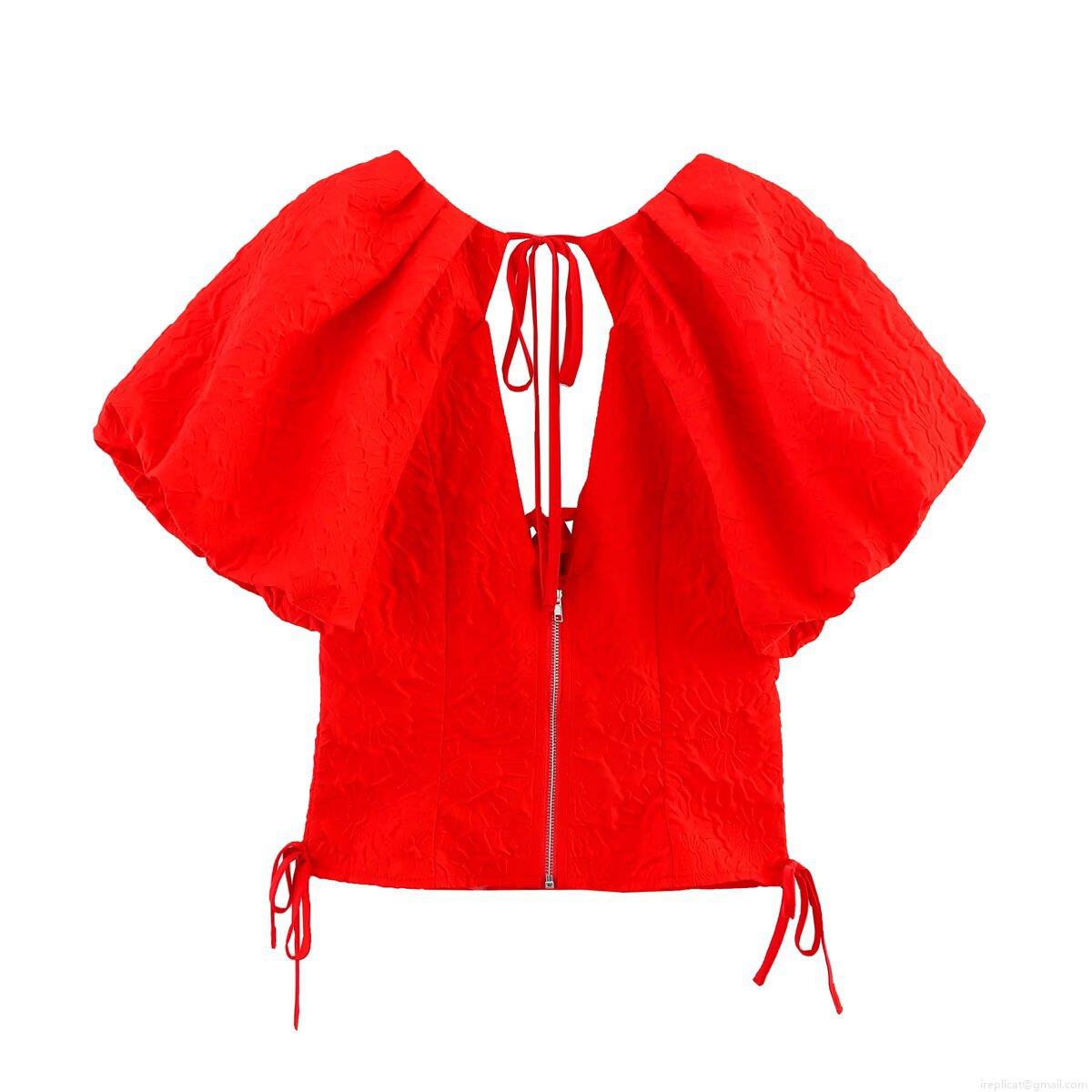 Women's Sexy V-Neck T-Shirt Jacquard Polyester Puff Sleeve Backless Lace-Up Short Top Summer Streetwear Slim Fit Red Blouse Fashion Lady