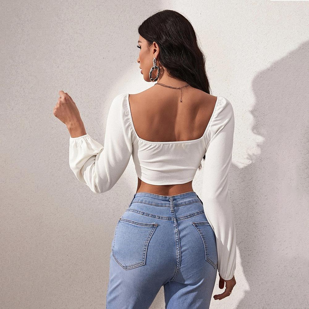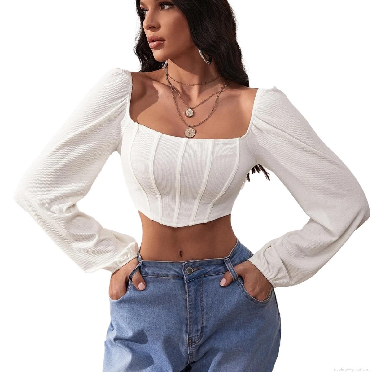 Women's Sexy White Square Neck Long Sleeve Rayon Polyester Crop Top Corset Style Ribbed Knit T-Shirt Slim Fit Casual Fashion Spring Autumn Top