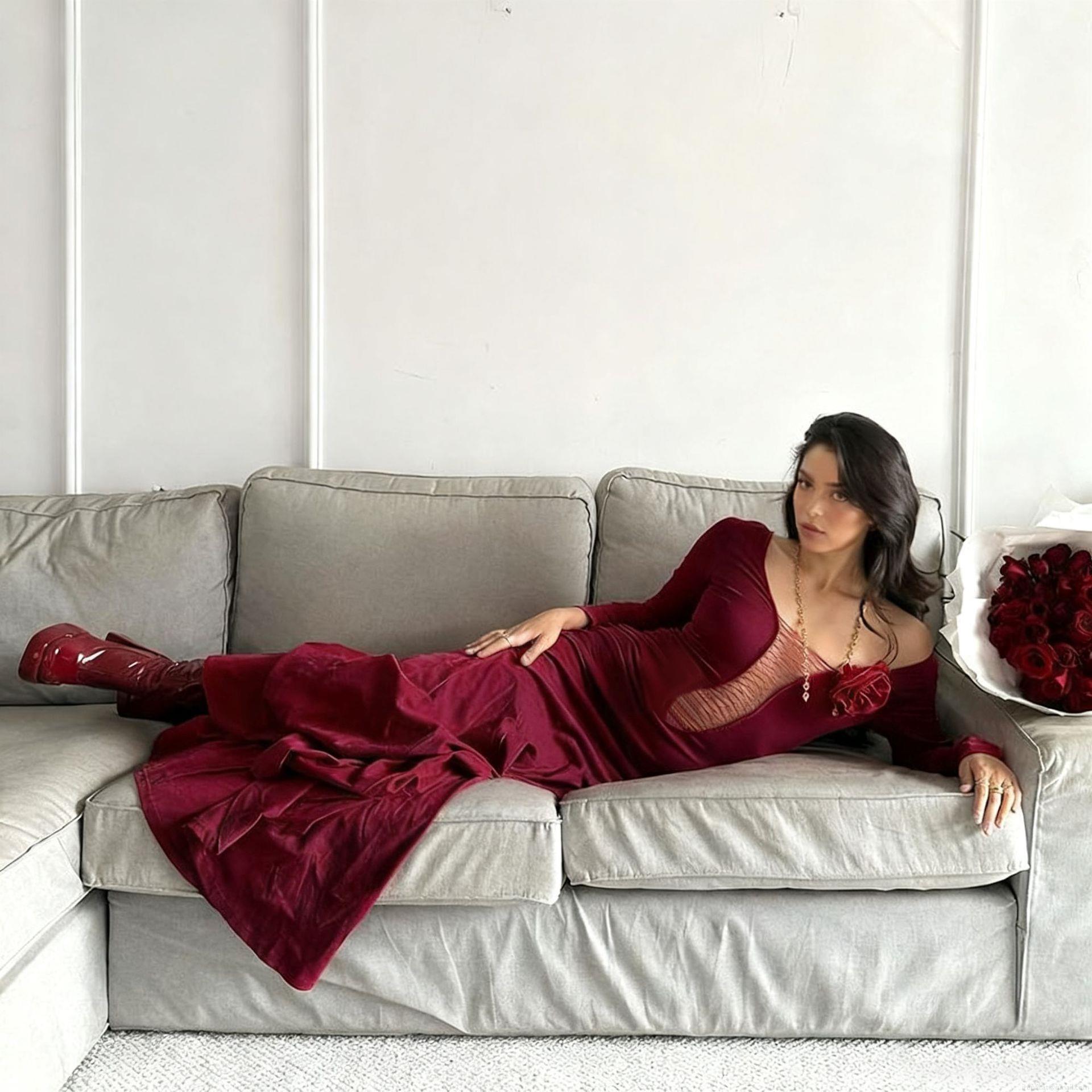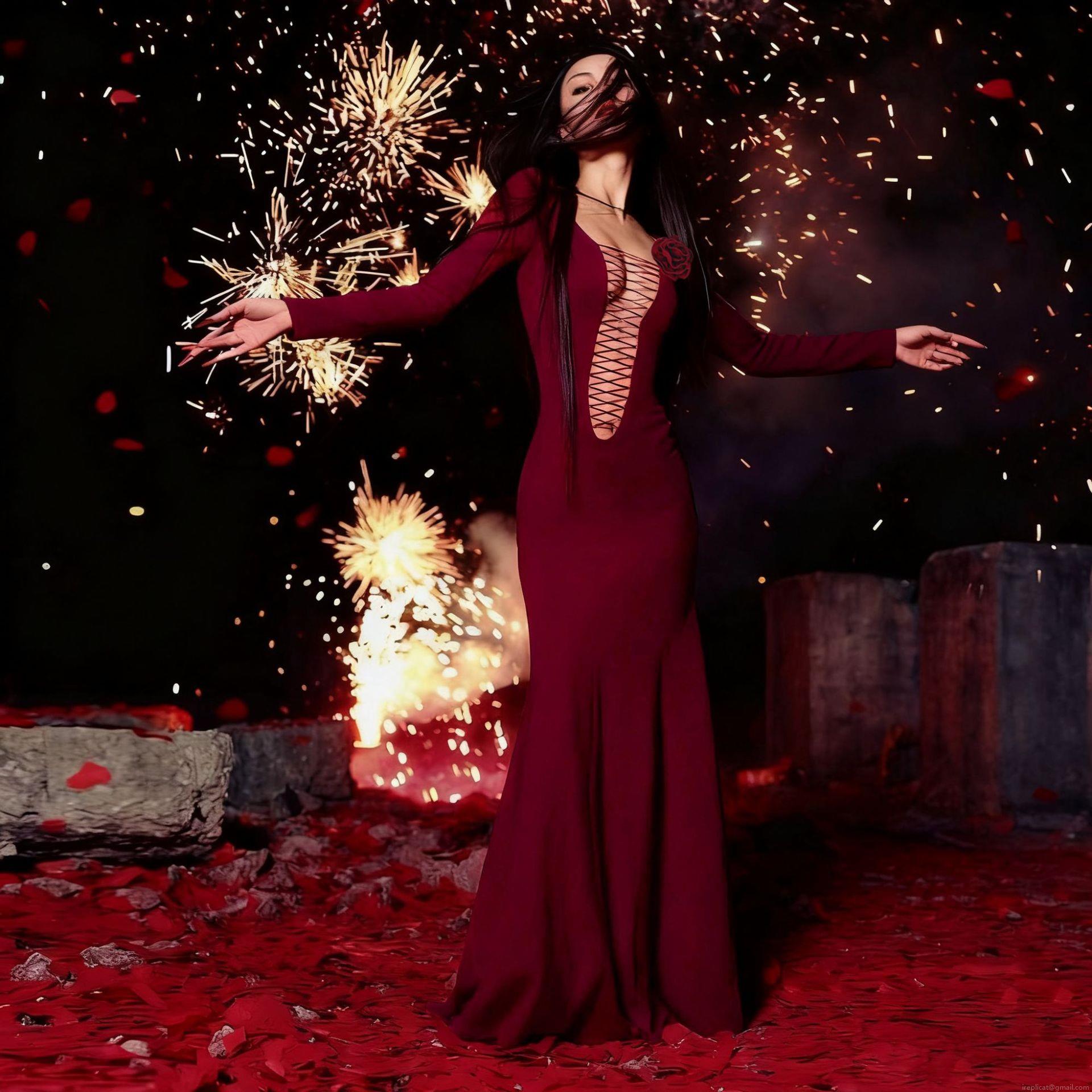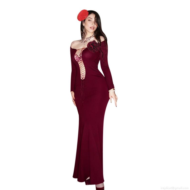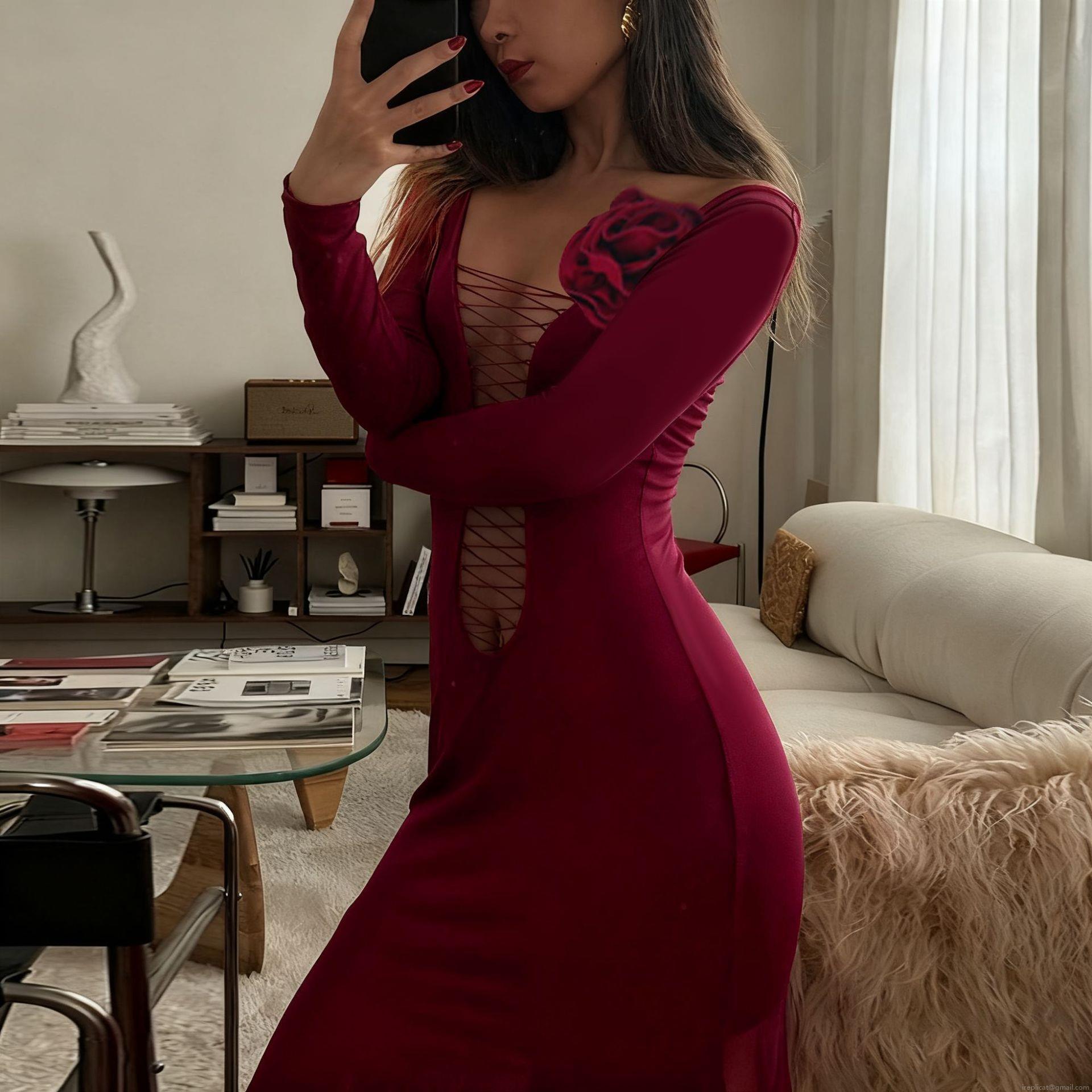 Women's Sexy Wine Red Long Sleeve Fishtail Maxi Dress Retro French Hollow Out Lace-up V-Neck Bodycon Evening Party Dress With 3D Rose Flower Detail