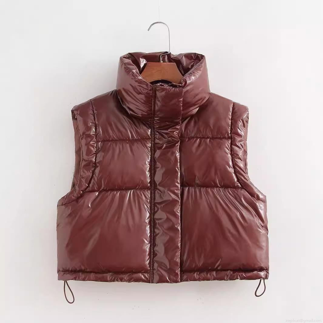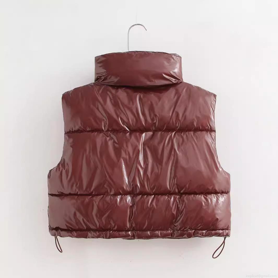 Women's Shiny Patent Leather Padded Vest Short Motorcycle Style High Collar Sleeveless Puffer Jacket Deep Brown Wine Red Padded Waistcoat for Streetwear Autumn Winter