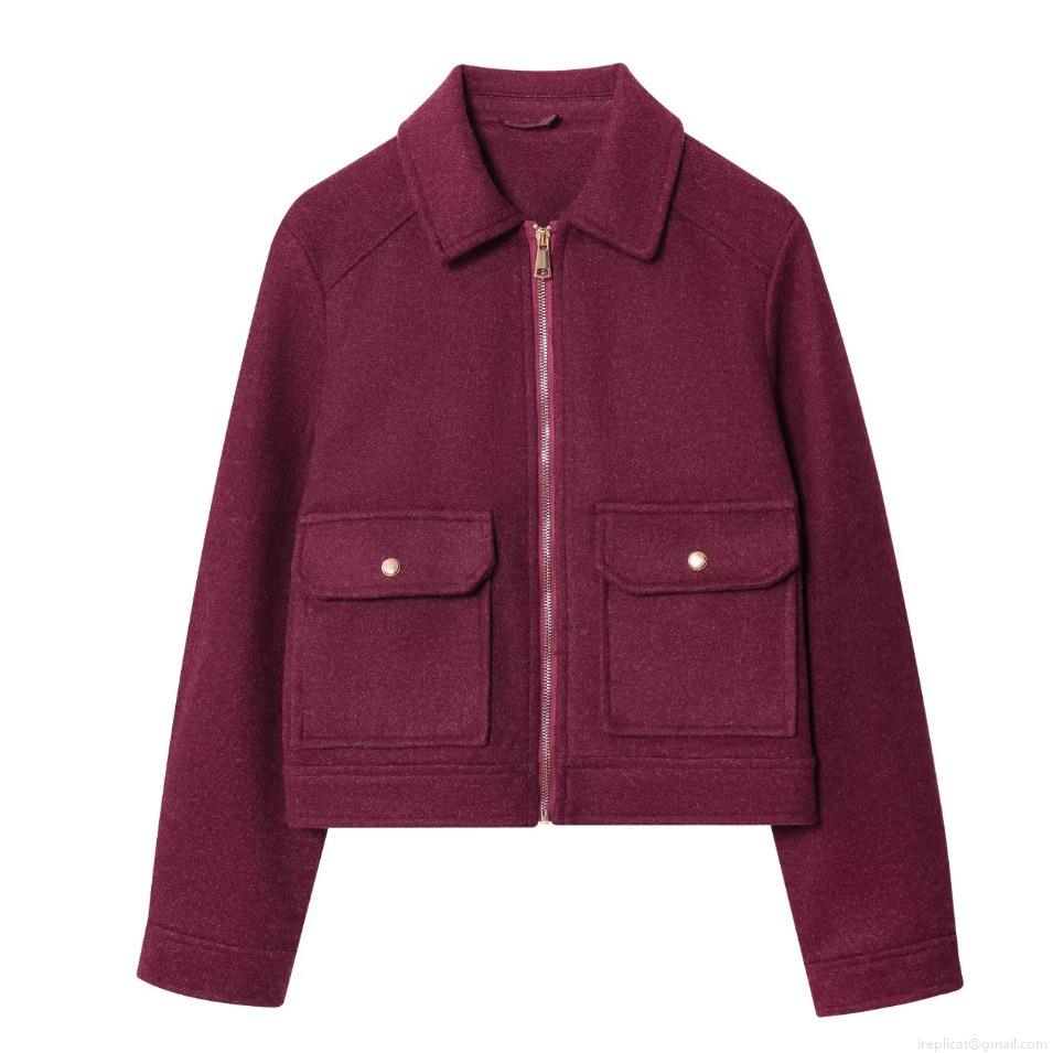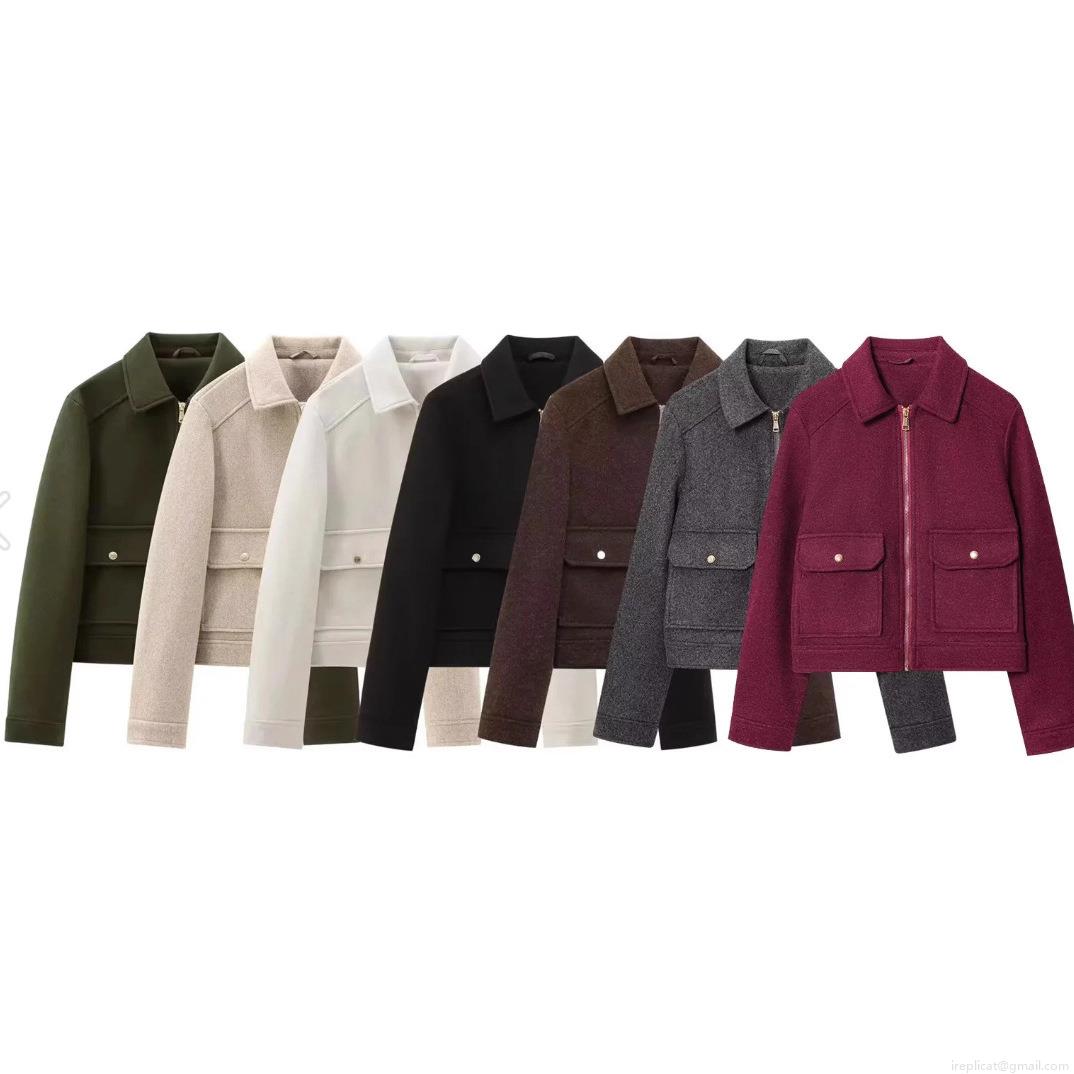Women's Short Jacket Woolen Fleece Zipper Up Coat With Flap Pockets Casual Autumn Winter Outerwear Fashion Loose Fit Lady Soft Solid Color Warm Lapel Top