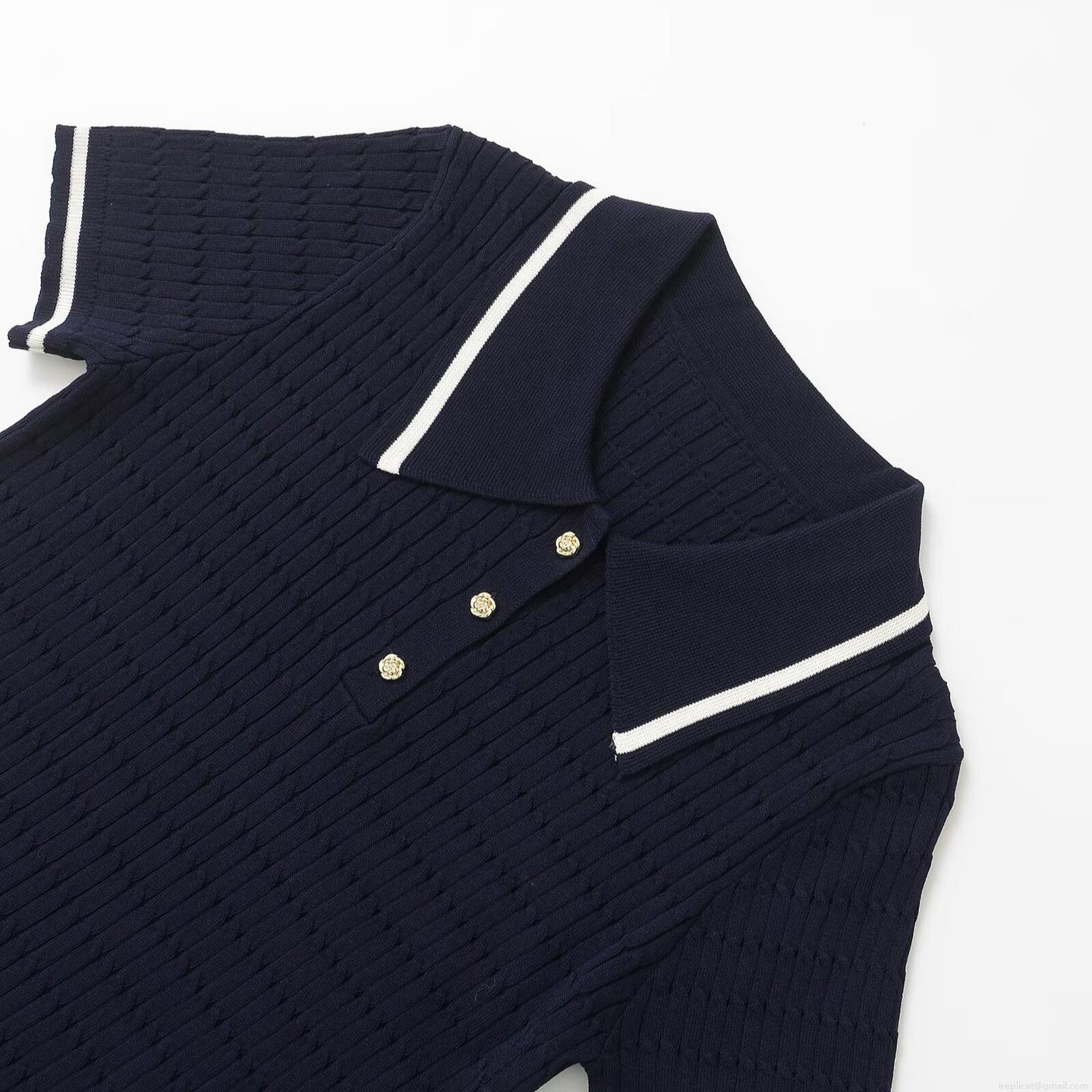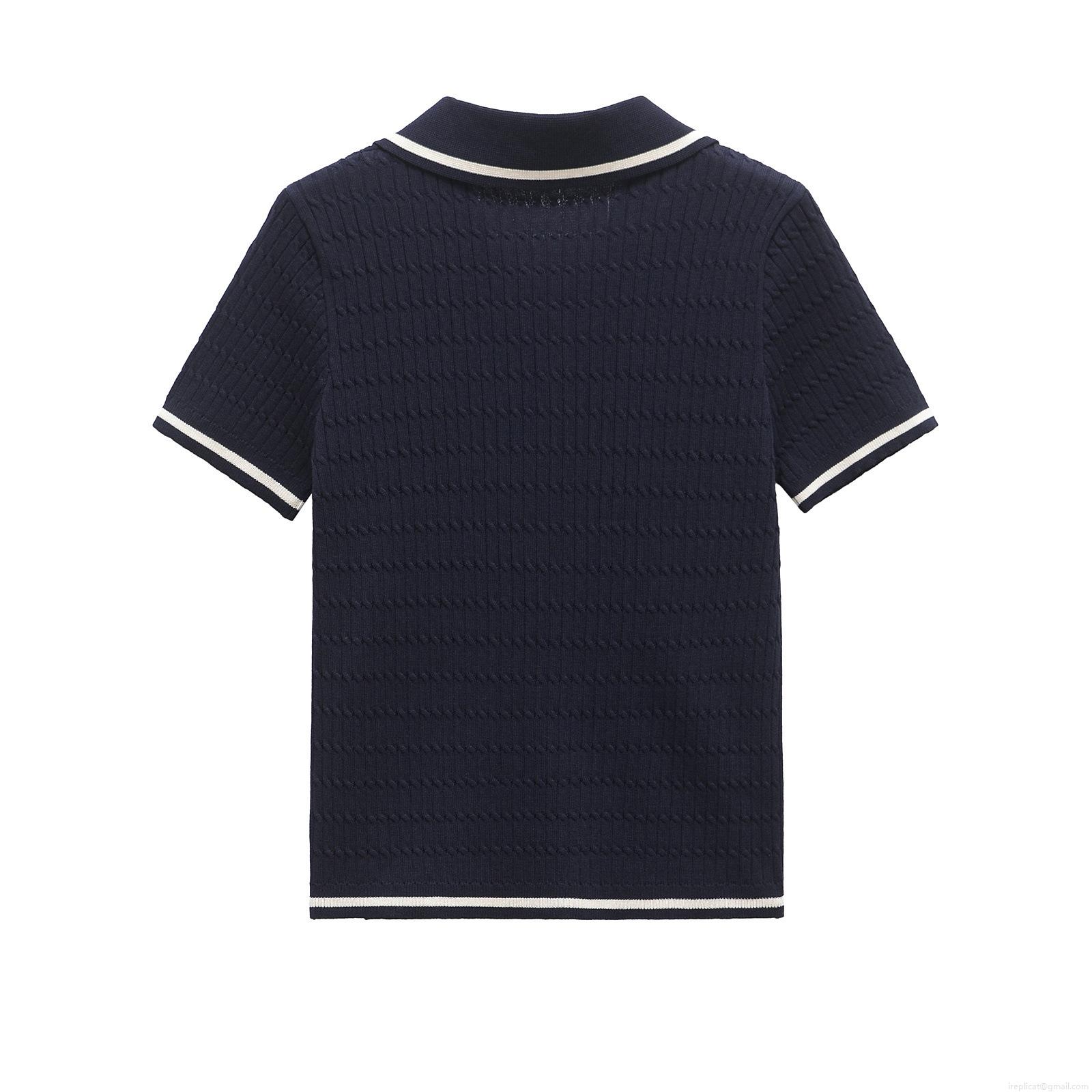Women's Short Sleeve Knit Polo Shirt Contrast Stripe Lapel Cable Knit Top With Gold Buttons Casual Mercerized Cotton T-Shirt For Women
