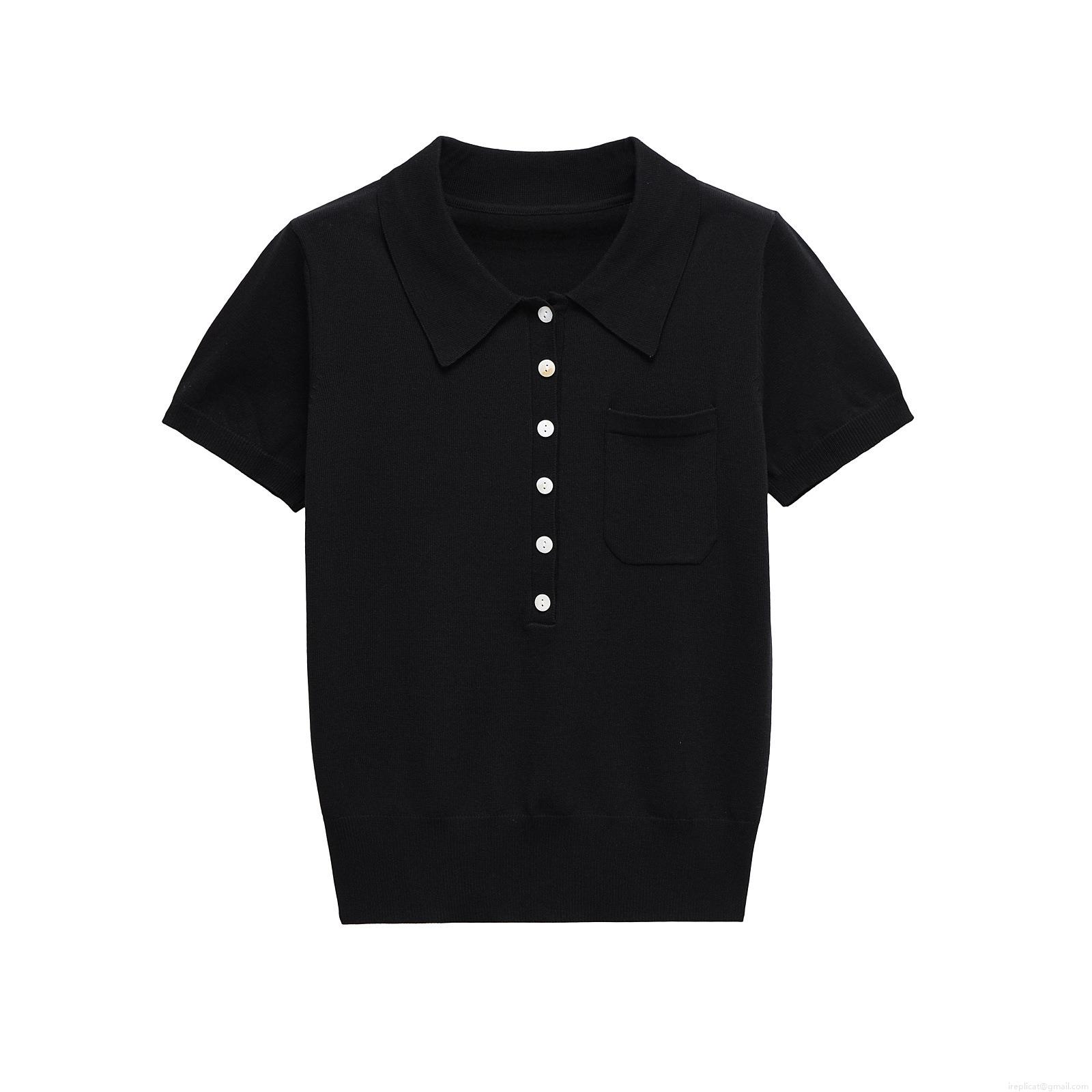 French Style Contrast Trim Knit T-Shirt Elegant Mercerized Cotton...