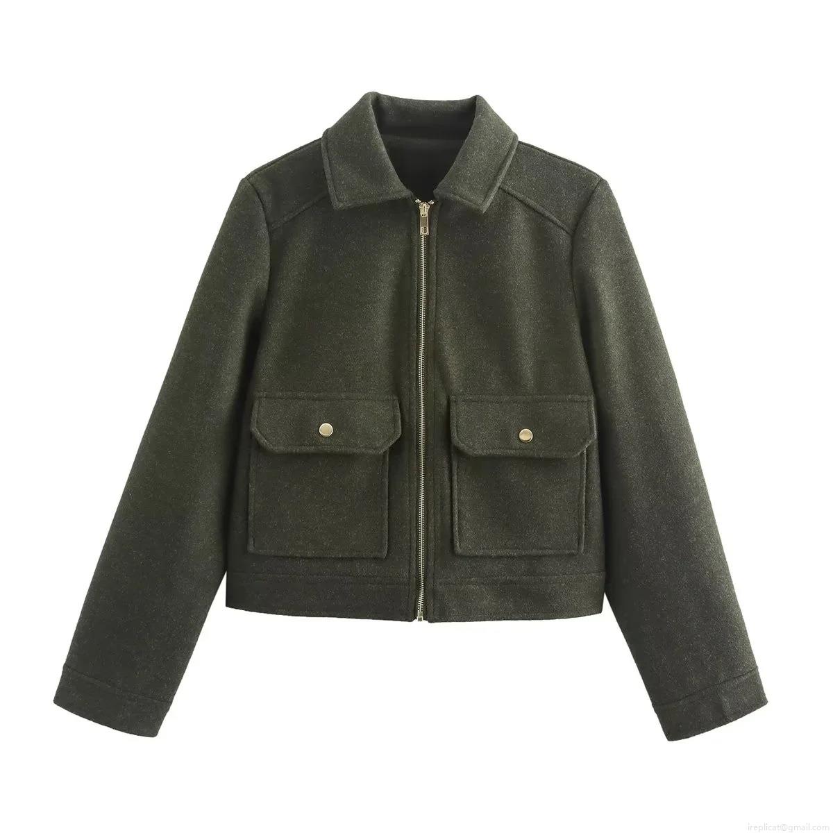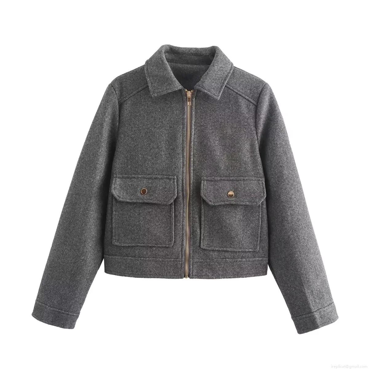 Women's Short Woolen Like Jacket Lapel Zipper Closure Coat With Large Pockets Casual Loose Autumn Winter Warm Outerwear Fashion For Ladies