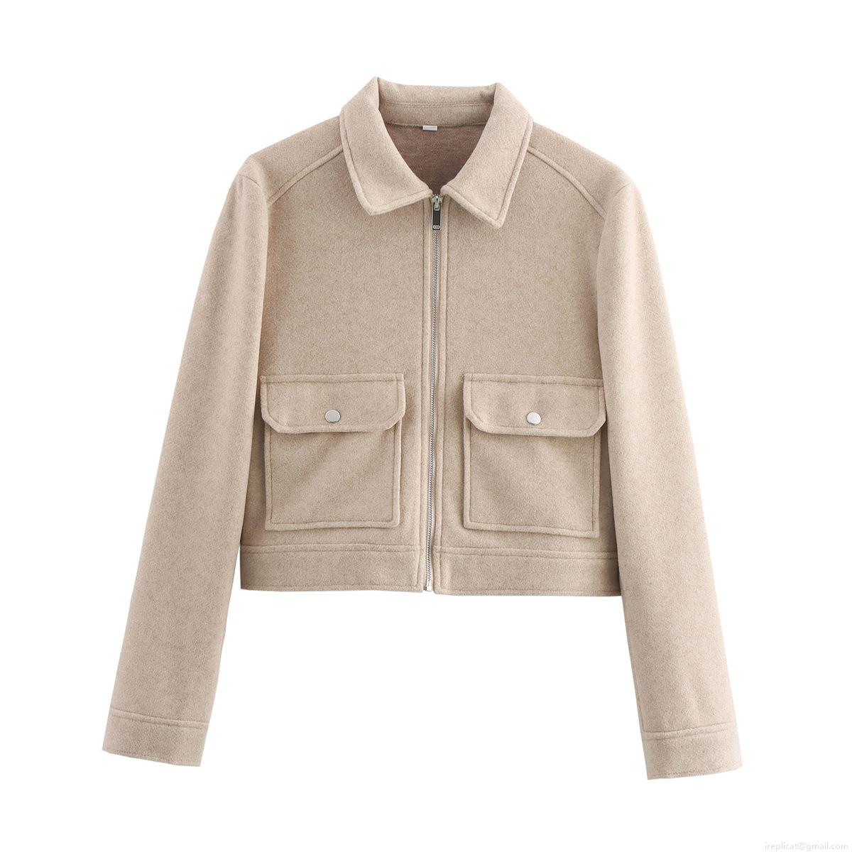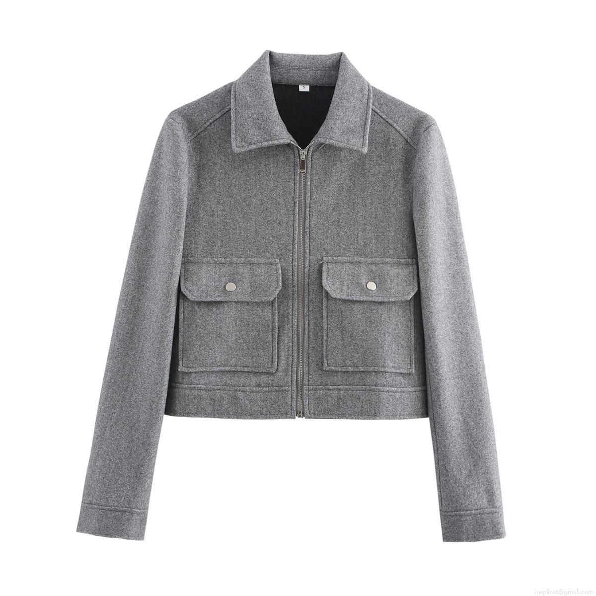 Women's Casual Woolen Crop Jacket With Front Zipper And Double...