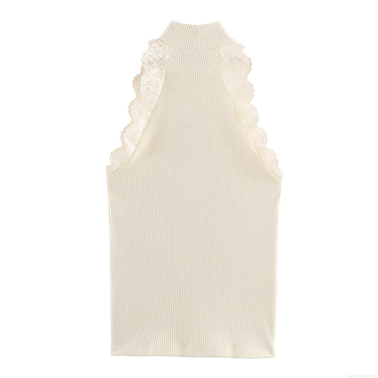 Women's Sleeveless T-Shirt Mock Neck Lace Trim Ribbed Knit Slim Fit Top Casual Solid Color Polyester Tank For Women Fashion Summer Vest