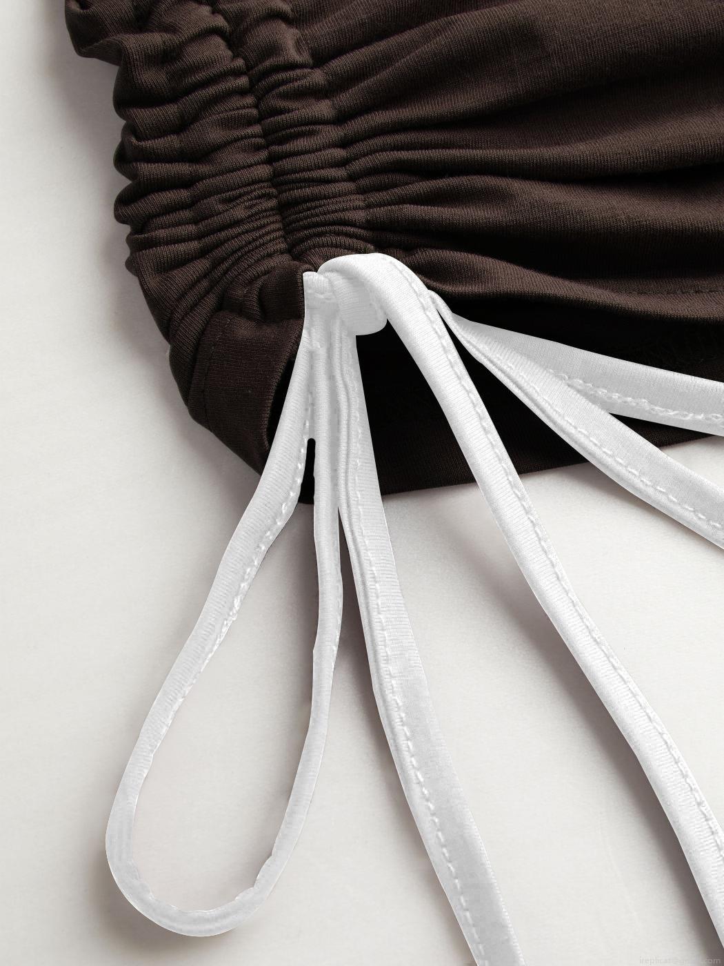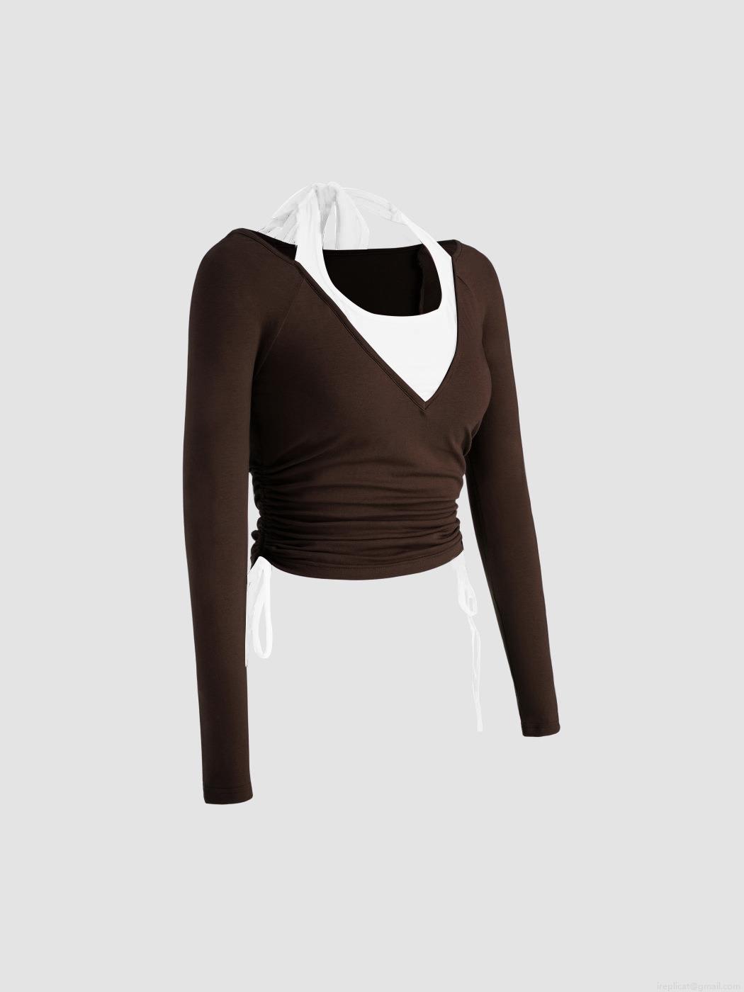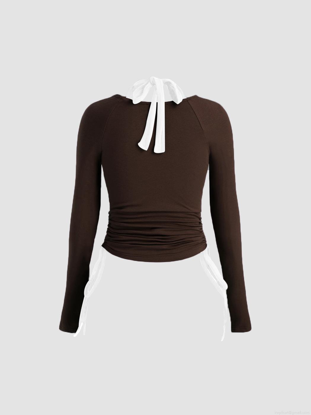 Women's Slim Fit Ribbed Knit Long Sleeve T-Shirt With Halter Neck Patchwork Contrast Color Drawstring Ruched Top Casual Elegant Tee