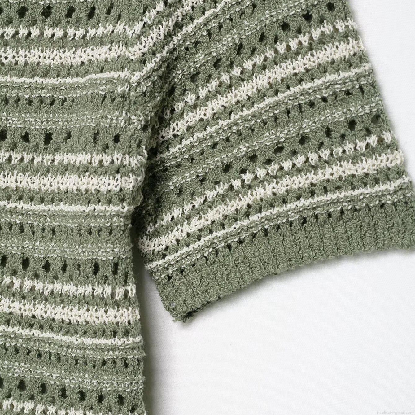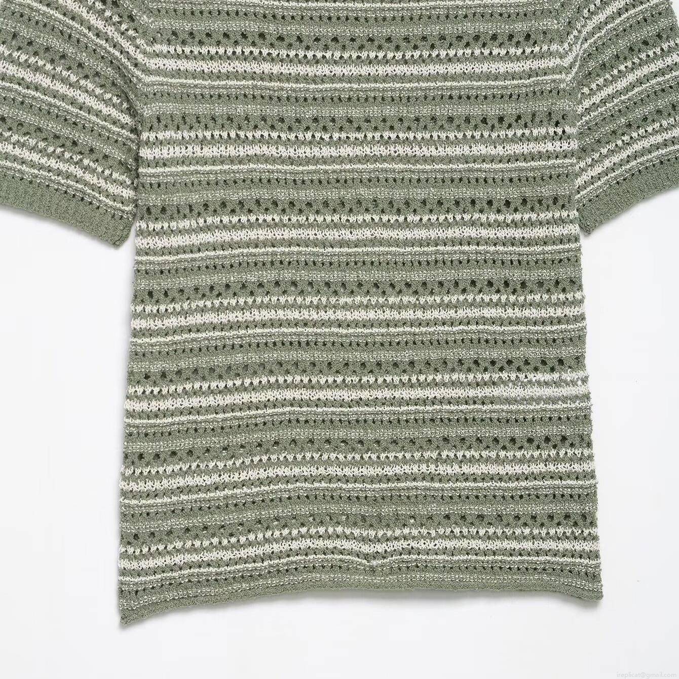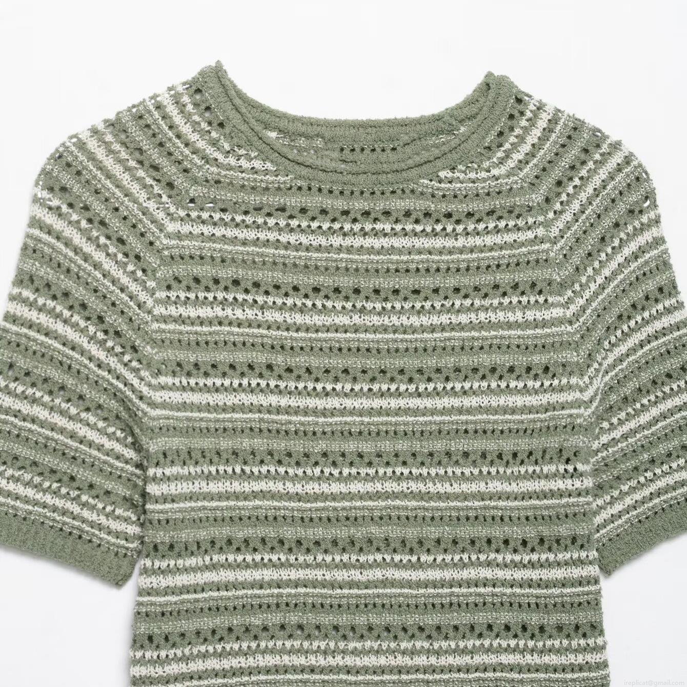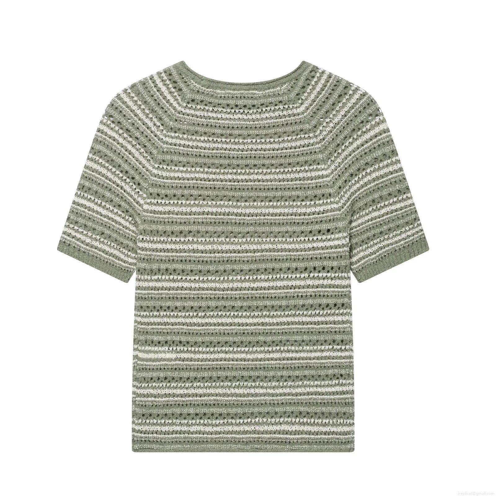 Women's Slim Fit Striped Knit T-Shirt Summer Short Sleeve Round Neck Hollow Out Crochet Top Sage Green White Striped Casual Pullover Clothing