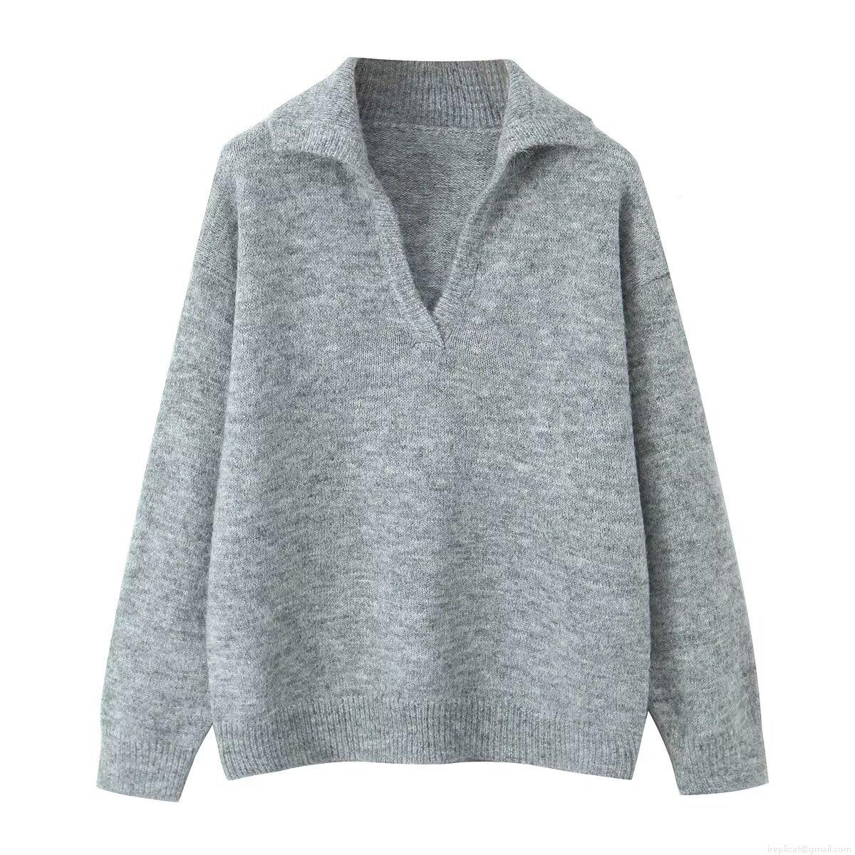 Women's Solid Color Knit Sweater Lapel V-Neck Loose Long Sleeve Pullover Warm Jumper Top For Autumn Winter