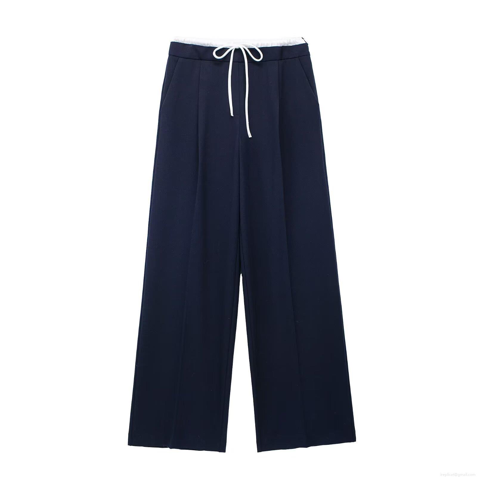 Women's Street Fashion Wide Leg Trousers Polyester Blended Drawstring Elastic Waist Casual Long Pants Streetwear Style Contrast Waistband For Women
