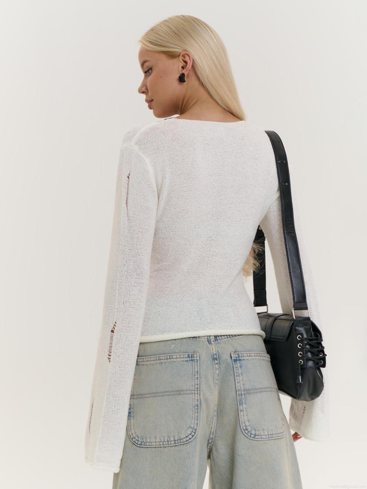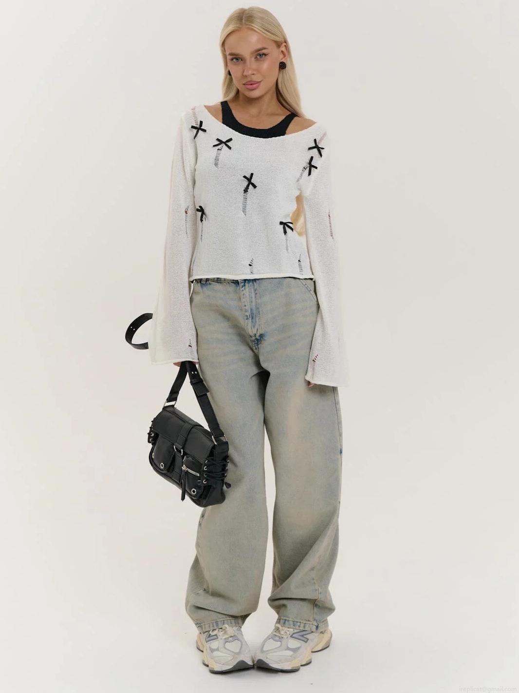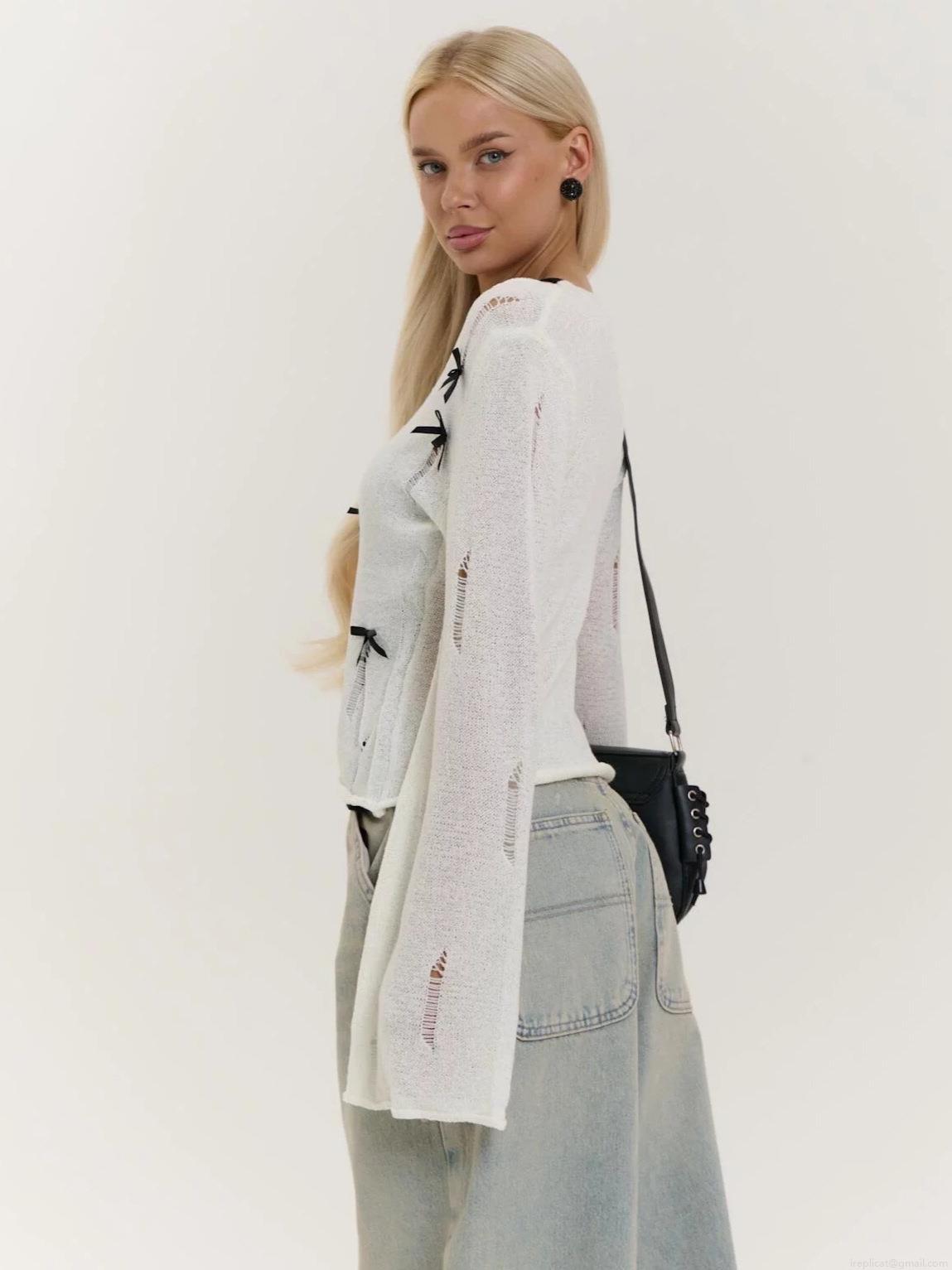 Women's Street Style White Distressed Knit Sweater With Black Ribbon Bows Splicing Long Sleeve Round Neck Loose Pullover Autumn Top Casual Sweet Cool Knitwear