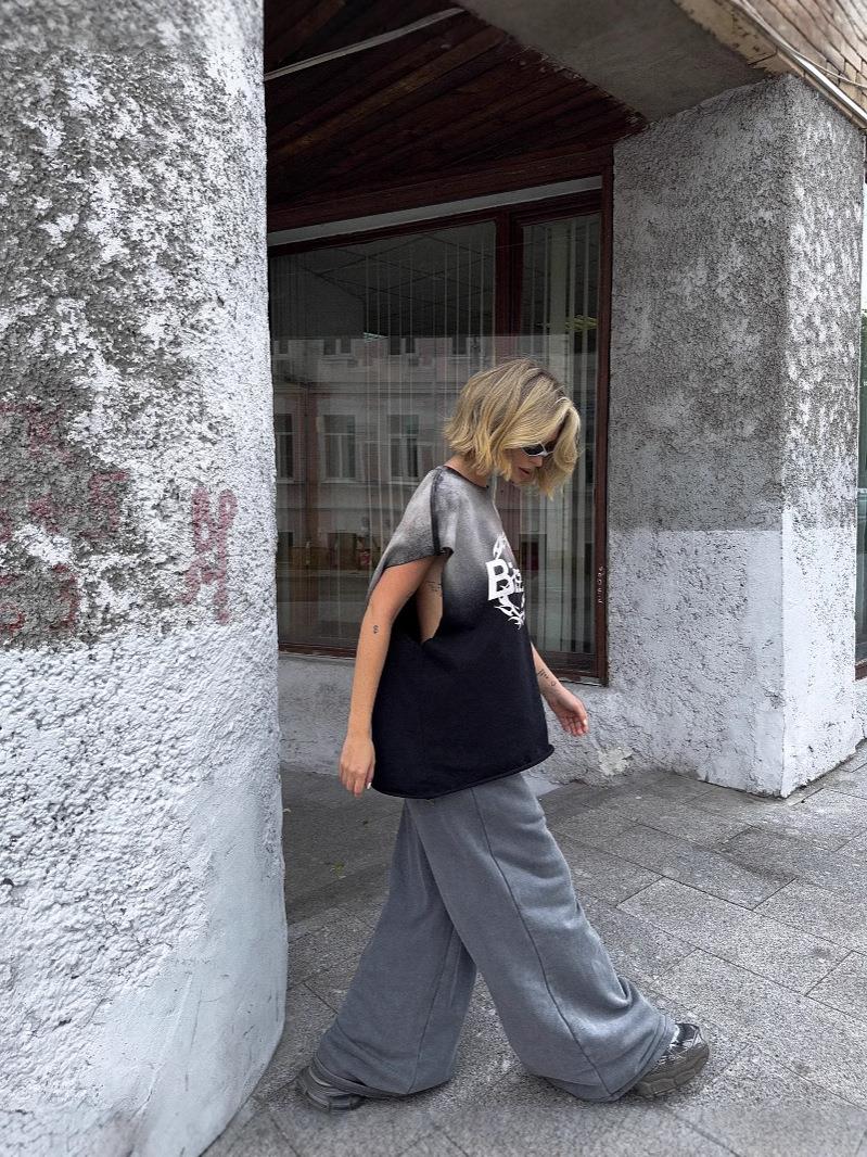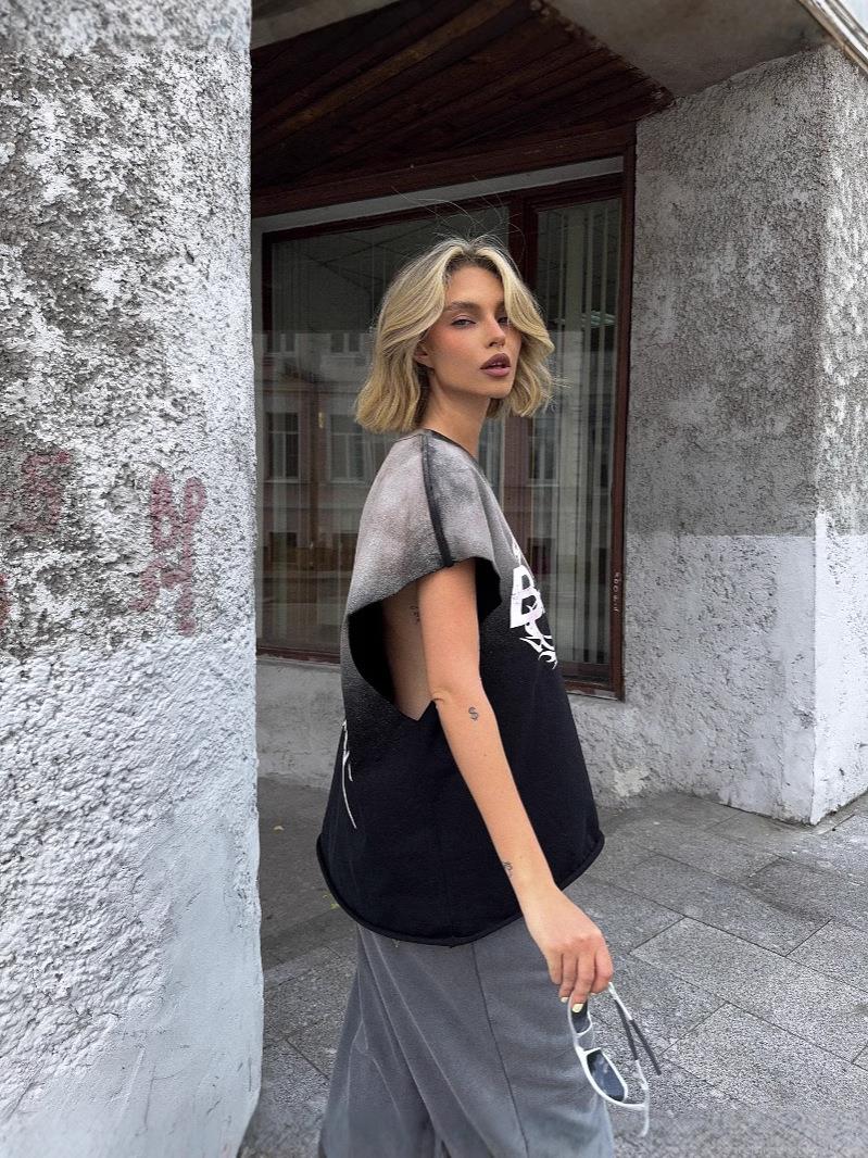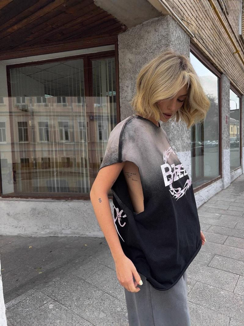 Women's Streetwear Heavyweight Cotton Sleeveless T-Shirt Vintage Gradient Tie-Dye Oversized Round Neck Tank Top Loose Retro Letter Print Pullover Tee For Summer Casual Daily Fashion