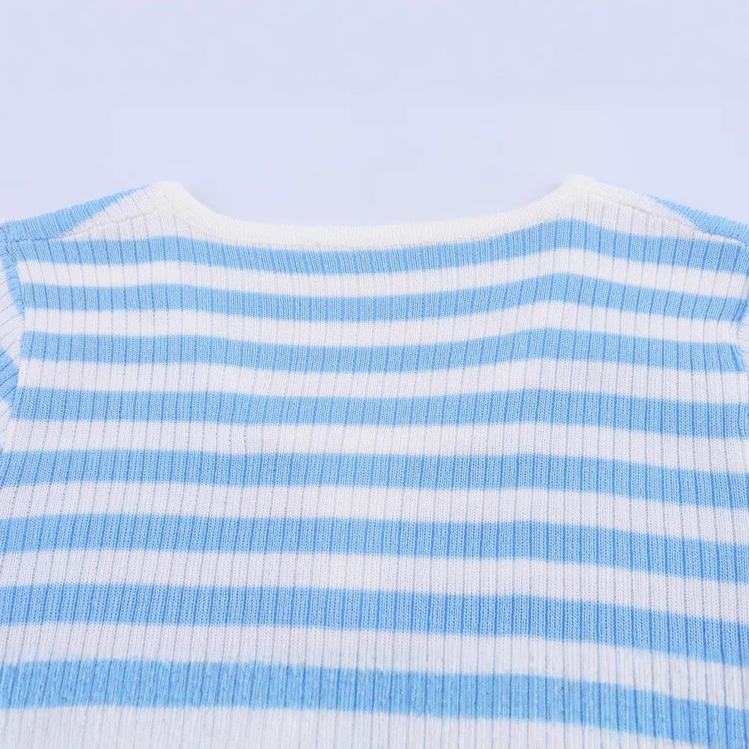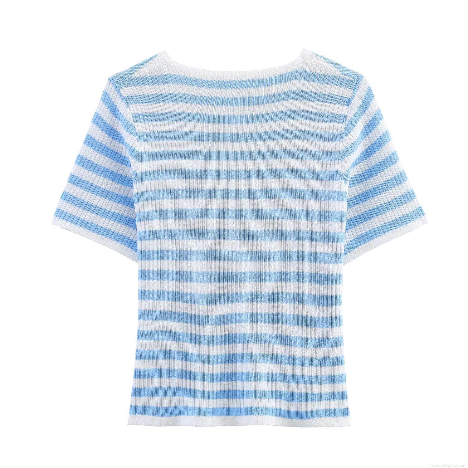 Women's Stripe Knit T-Shirt Casual Round Neck Short Sleeve Three Button Ribbed Polyester Pullover Top Summer Street Style Fashion Shirt