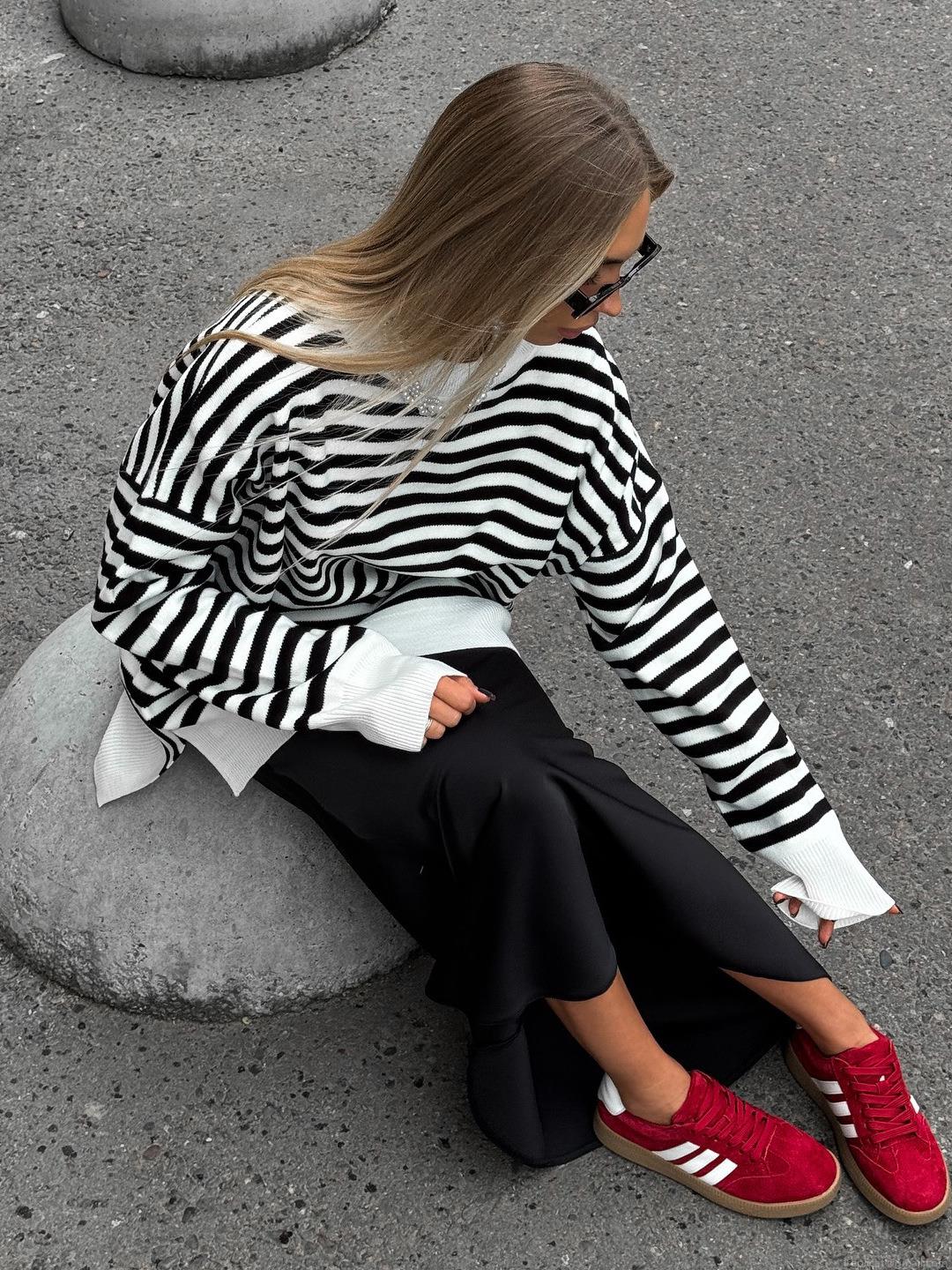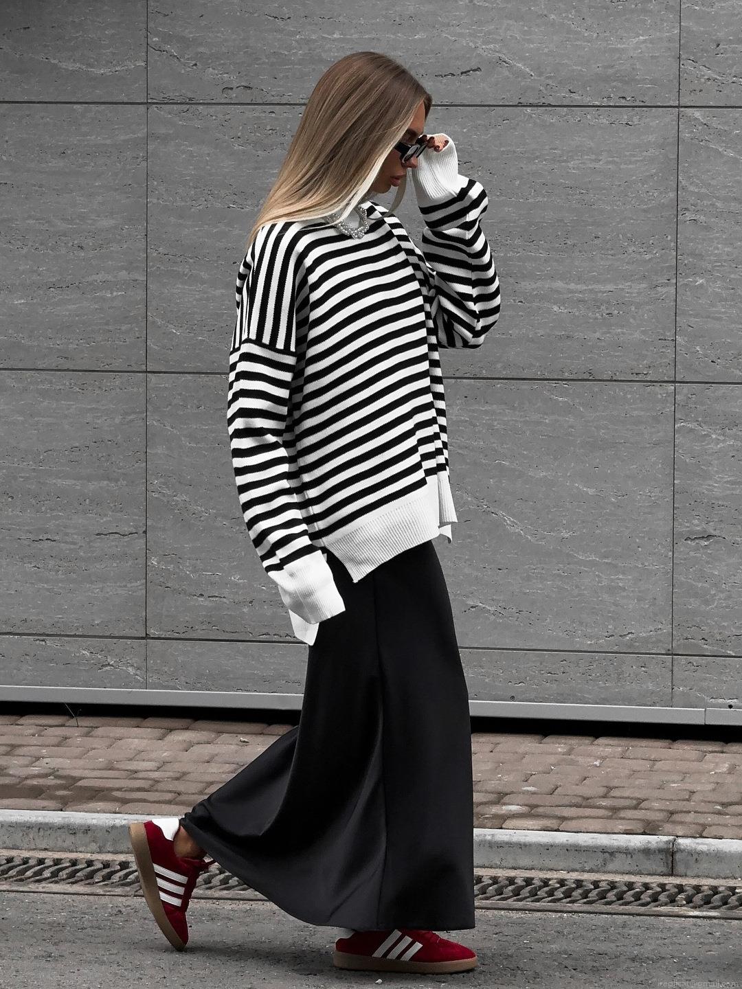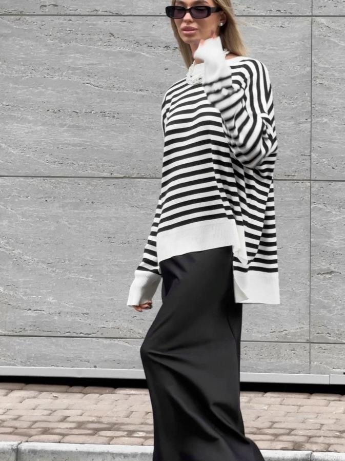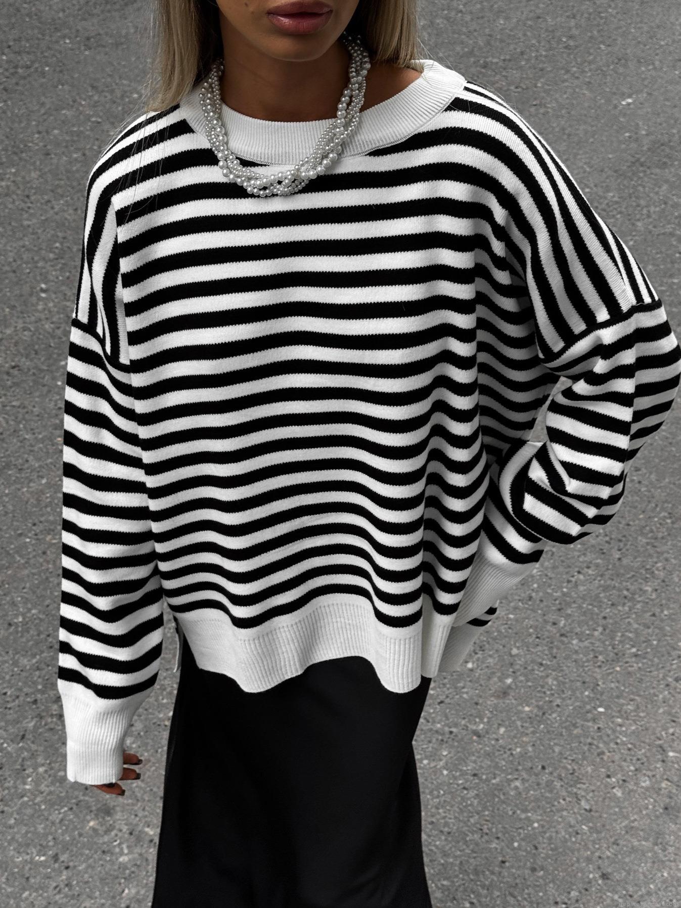 Women's Striped Knit Sweater Cotton Blend Oversized Long Sleeve Round Neck Pullover Streetwear Autumn Winter Loose Casual Striped Jumper For Women