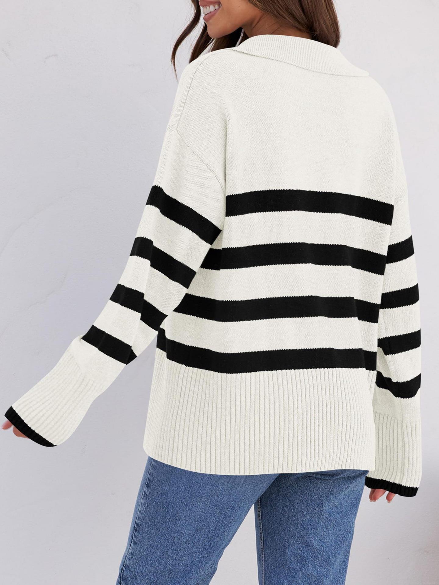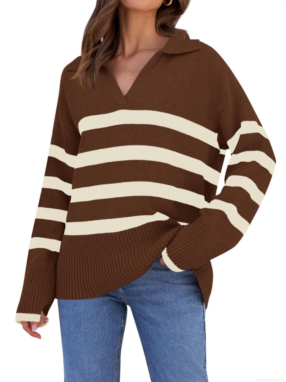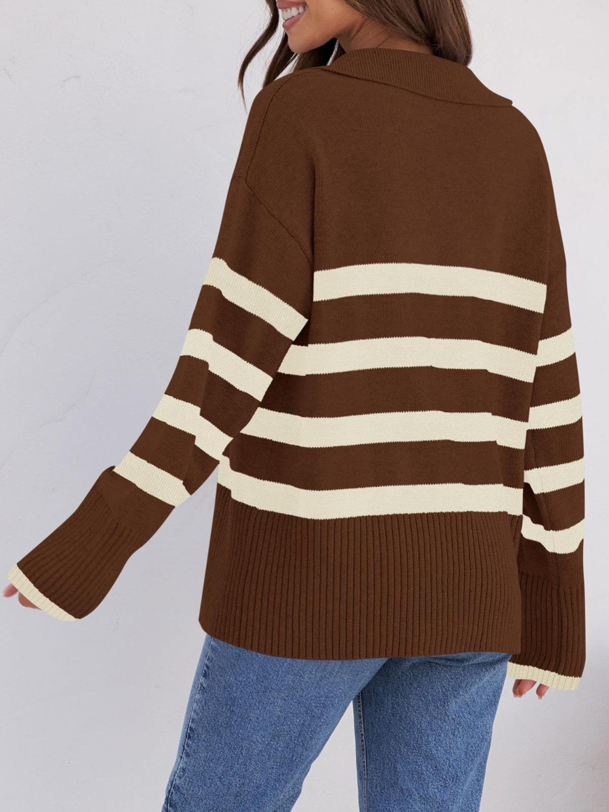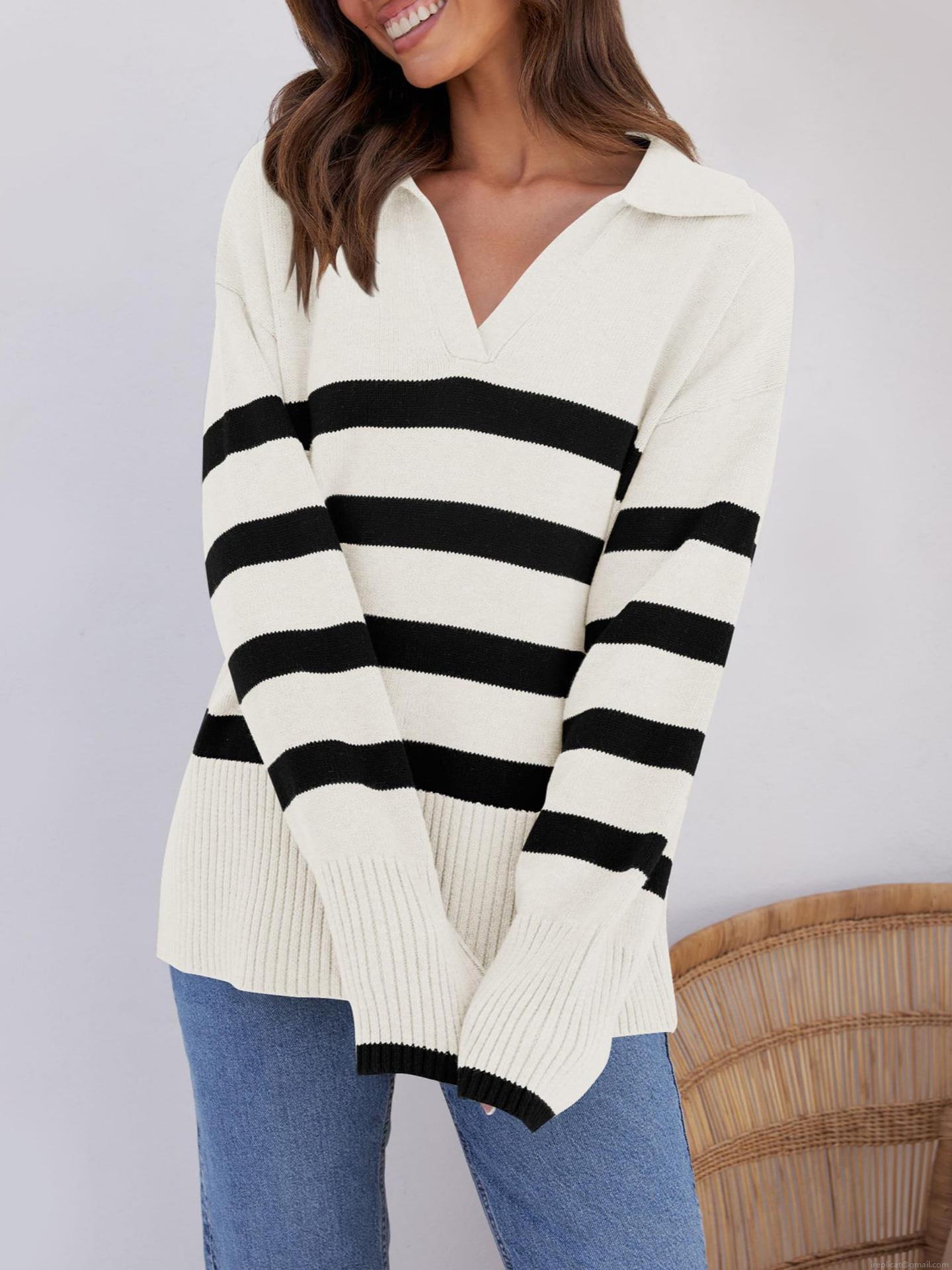 Women's Striped Knit Sweater Lapel V Neck Loose Fit Long Sleeve Pullover Polyester Spandex Blend Jumper For Autumn Winter Casual Office Wear
