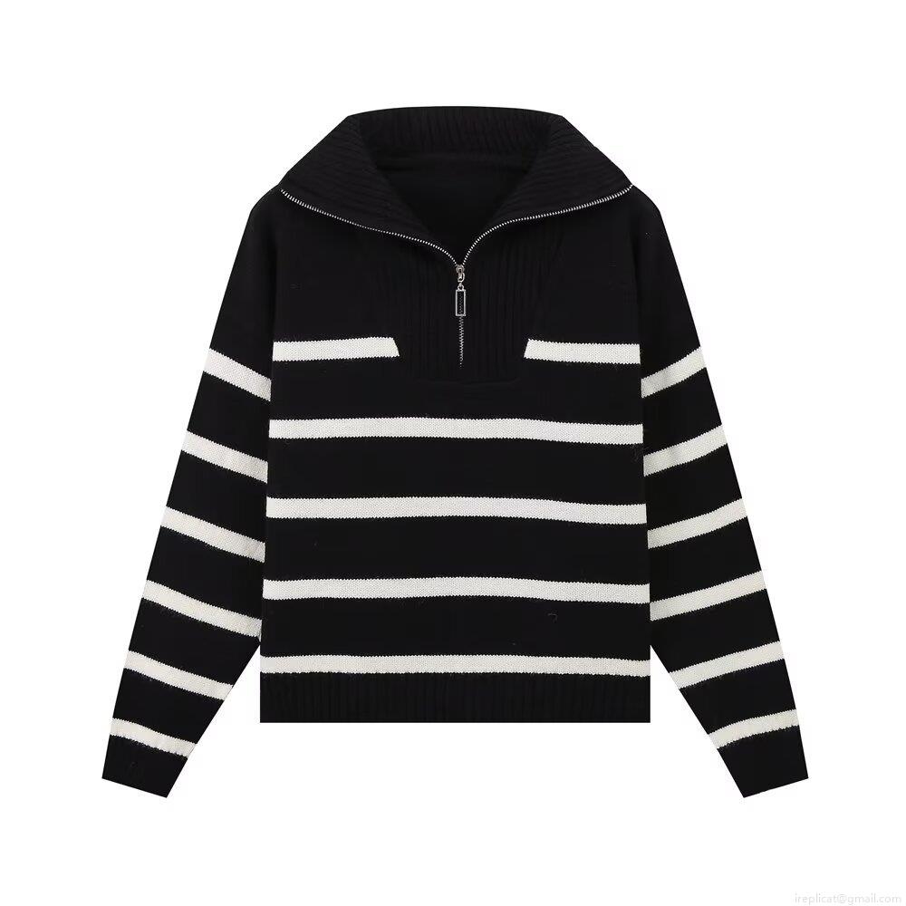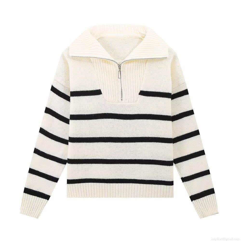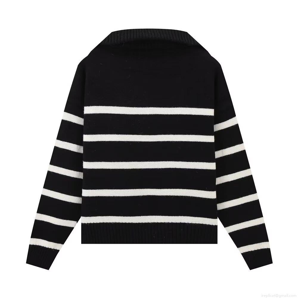 Women's Striped Knit Sweater Long Sleeve Half Zipper Polo Neck Pullover Casual Western Style Jumper Autumn Winter Fashion Knitwear Top