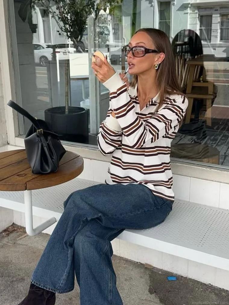 Women's Striped Long Sleeve Polo Shirt Retro Knitted Cotton Blend Streetwear Casual Lapel Collar Top For Spring Autumn Women Clothing