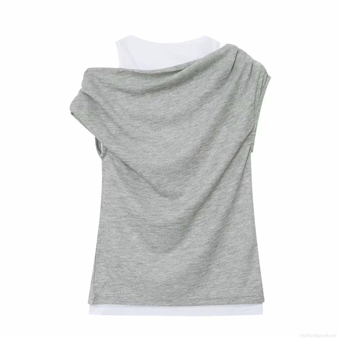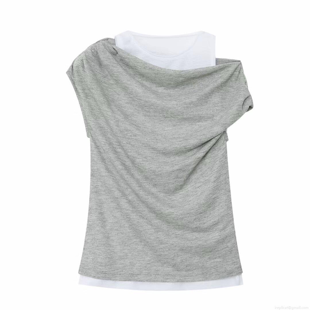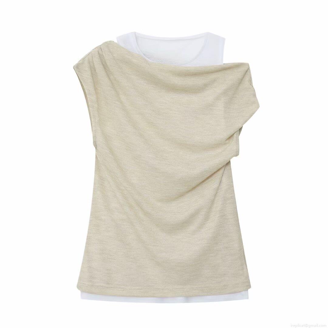 Women's Summer Fake Two-Piece Sleeveless Knit Tank Top Asymmetric Ruched Casual Streetwear Layered Round Neck T-Shirt For Women Vest Top