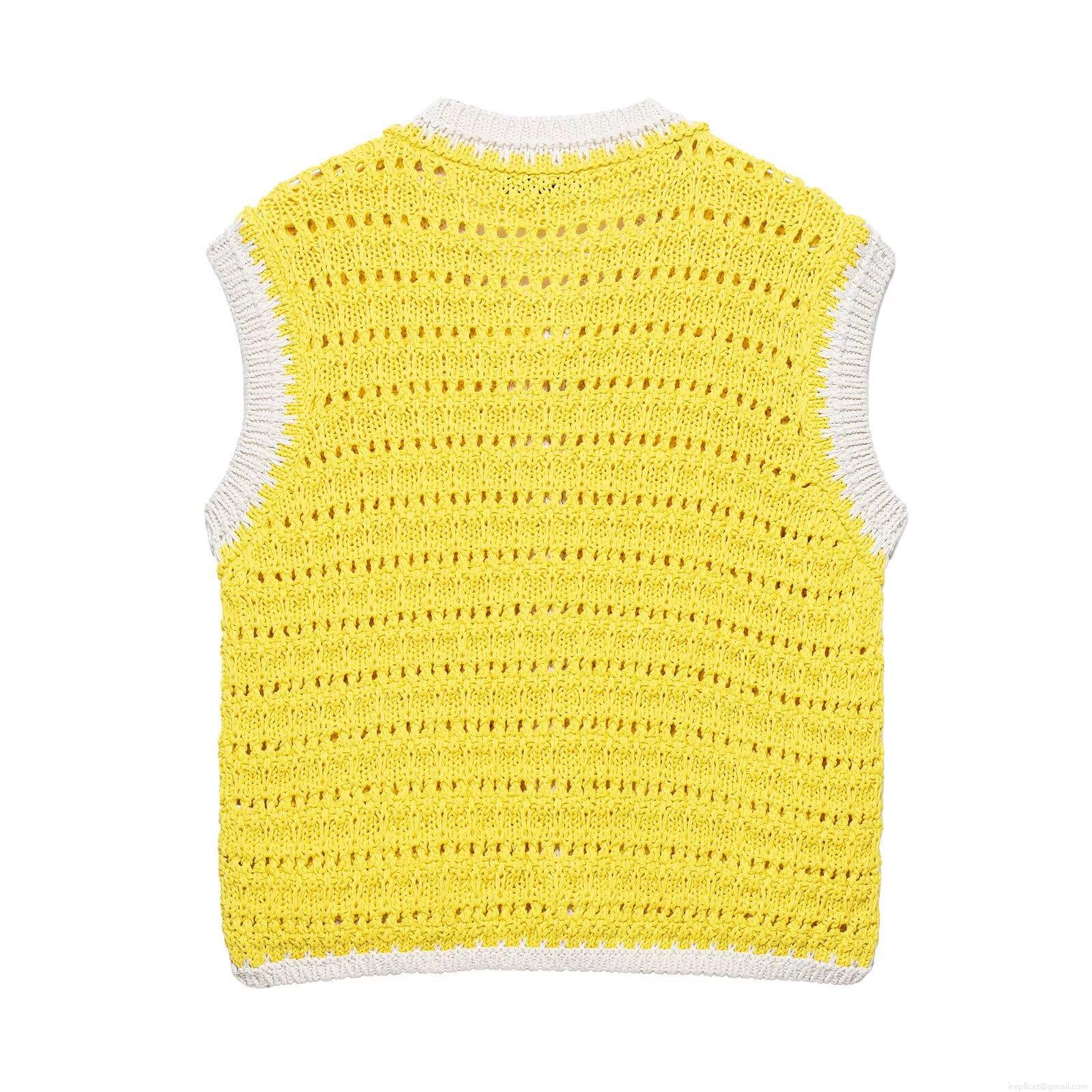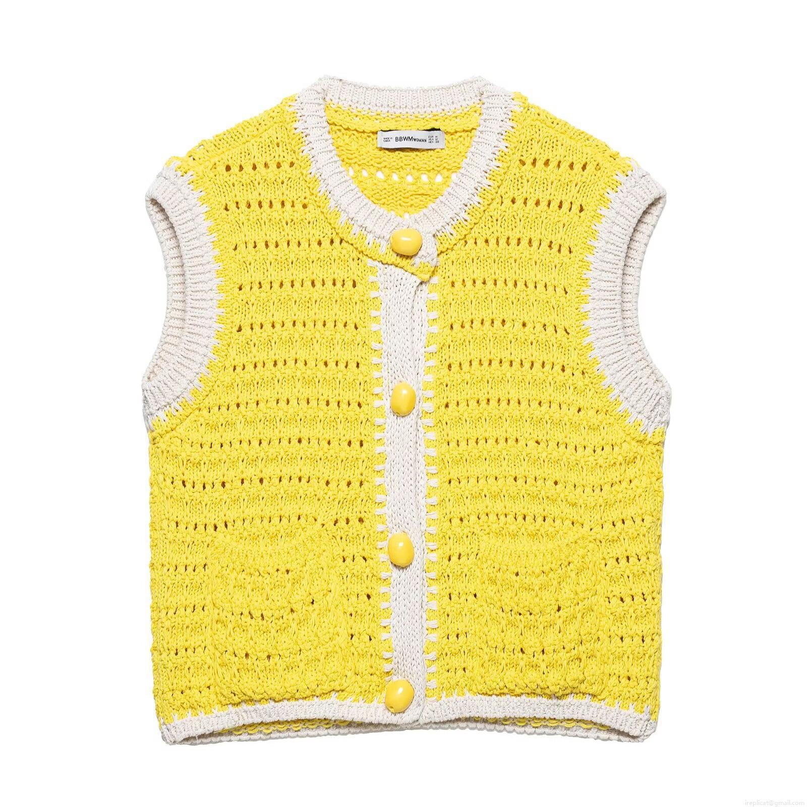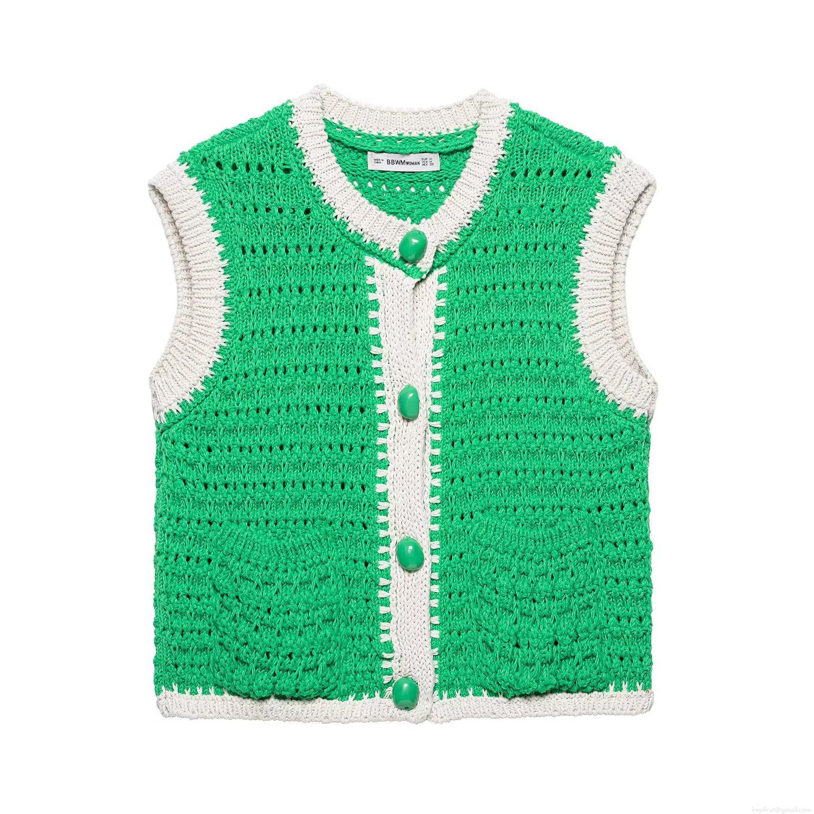 Women's Summer Knitted Vest Cardigan Contrast Crochet Trim Single Breasted Round Neck Sleeveless Top Casual Streetwear Crochet Knitwear