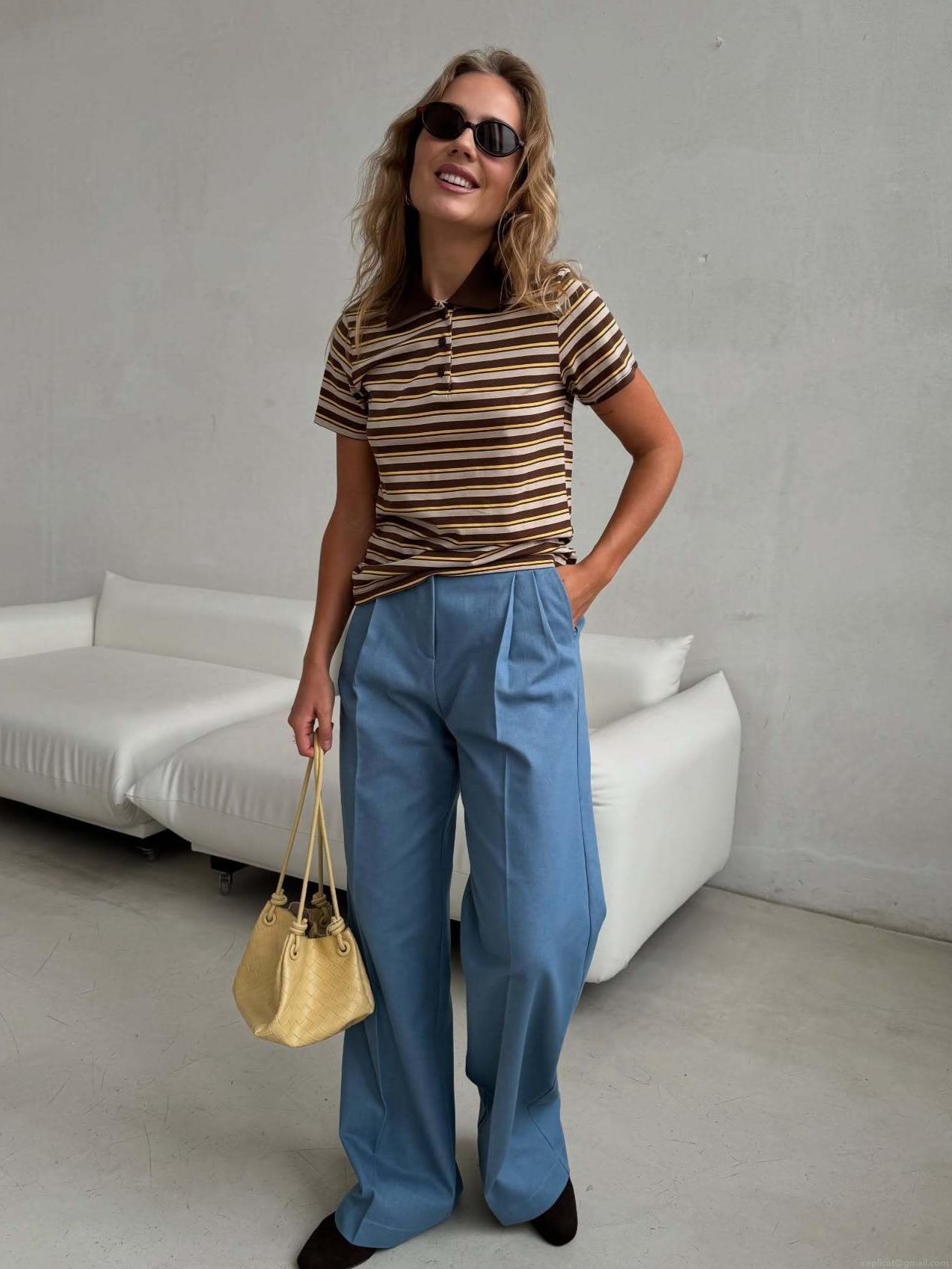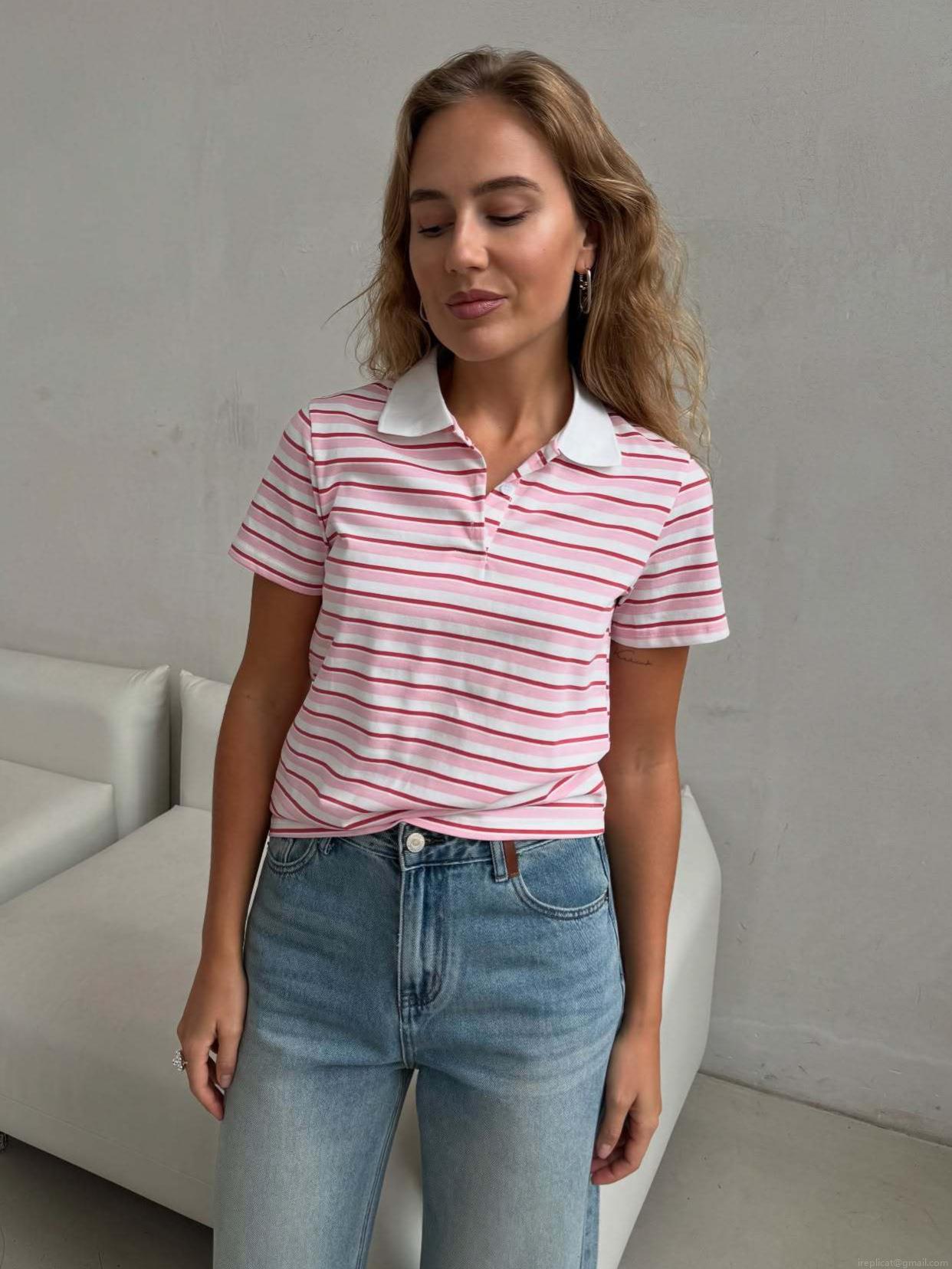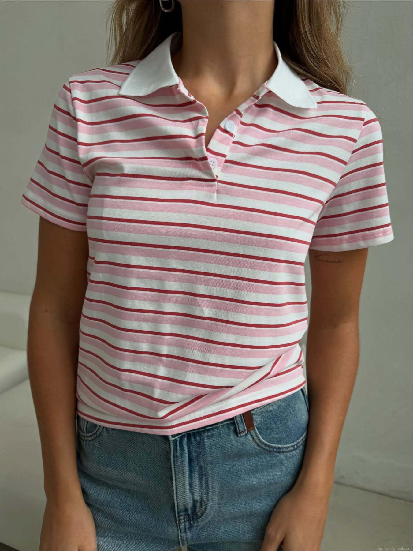 Women's Striped Knitted Polo T-Shirt Short Sleeve Lapel Button Down...