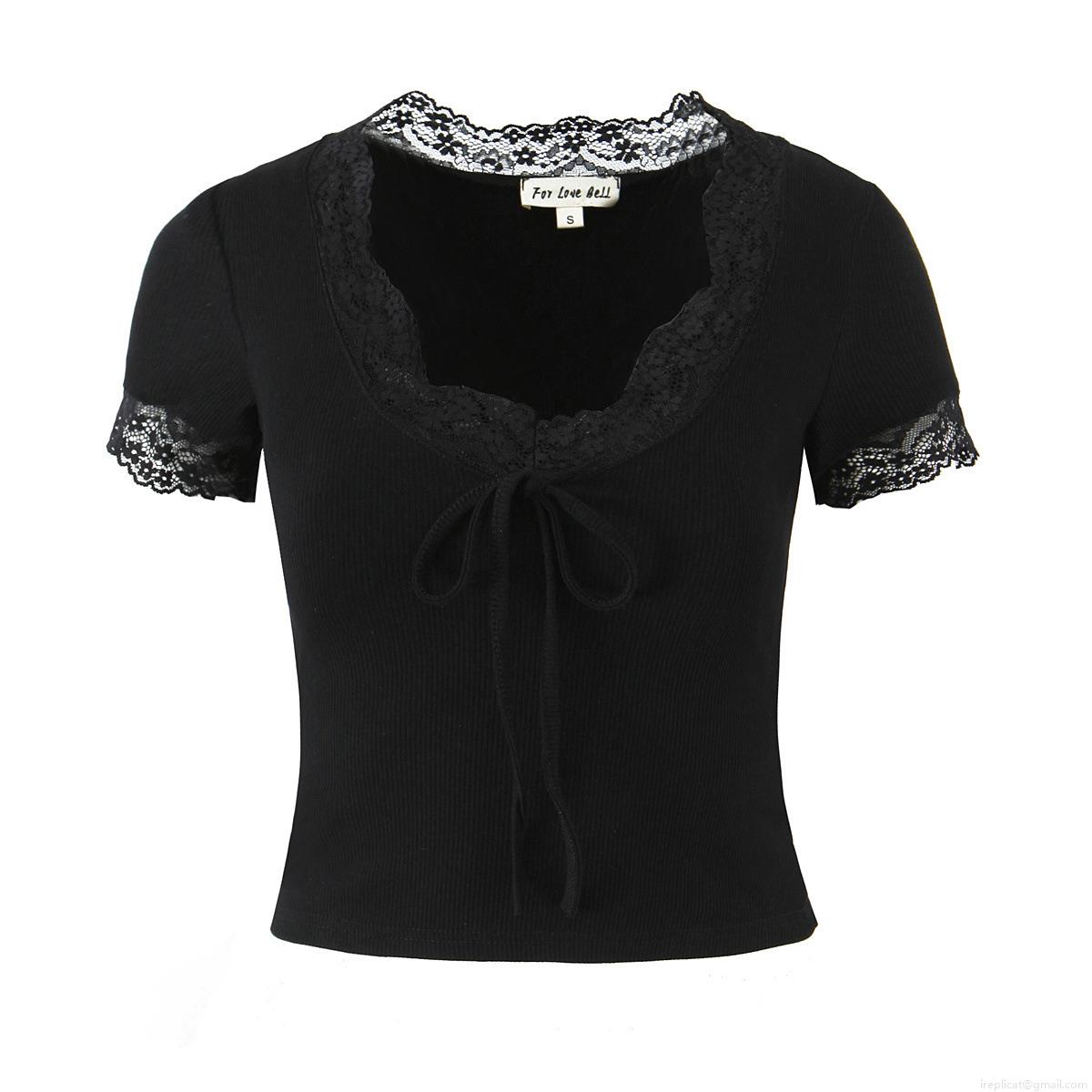Women's Summer V-Neck Lace Patchwork T-Shirt Sexy Short Sleeve Ribbed Knit Top With Bow Tie Front Casual Slim Fit Streetwear Cotton Blend Blouse