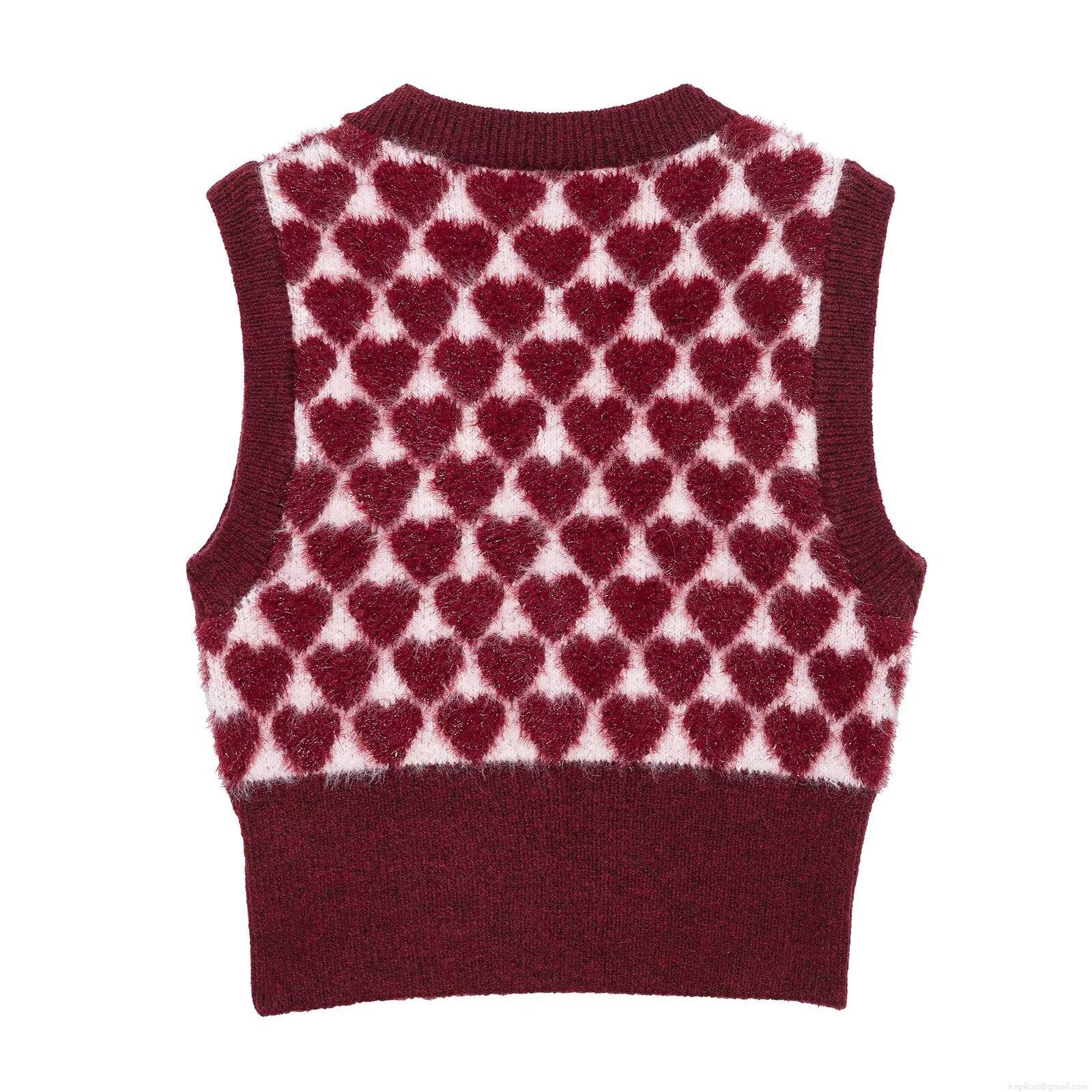 Women's Sweet Heart Jacquard Knitted Vest Short Crew Neck Button Down Gilet Heart Pattern Soft Sleeveless Sweater Cardigan For Spring Streetwear
