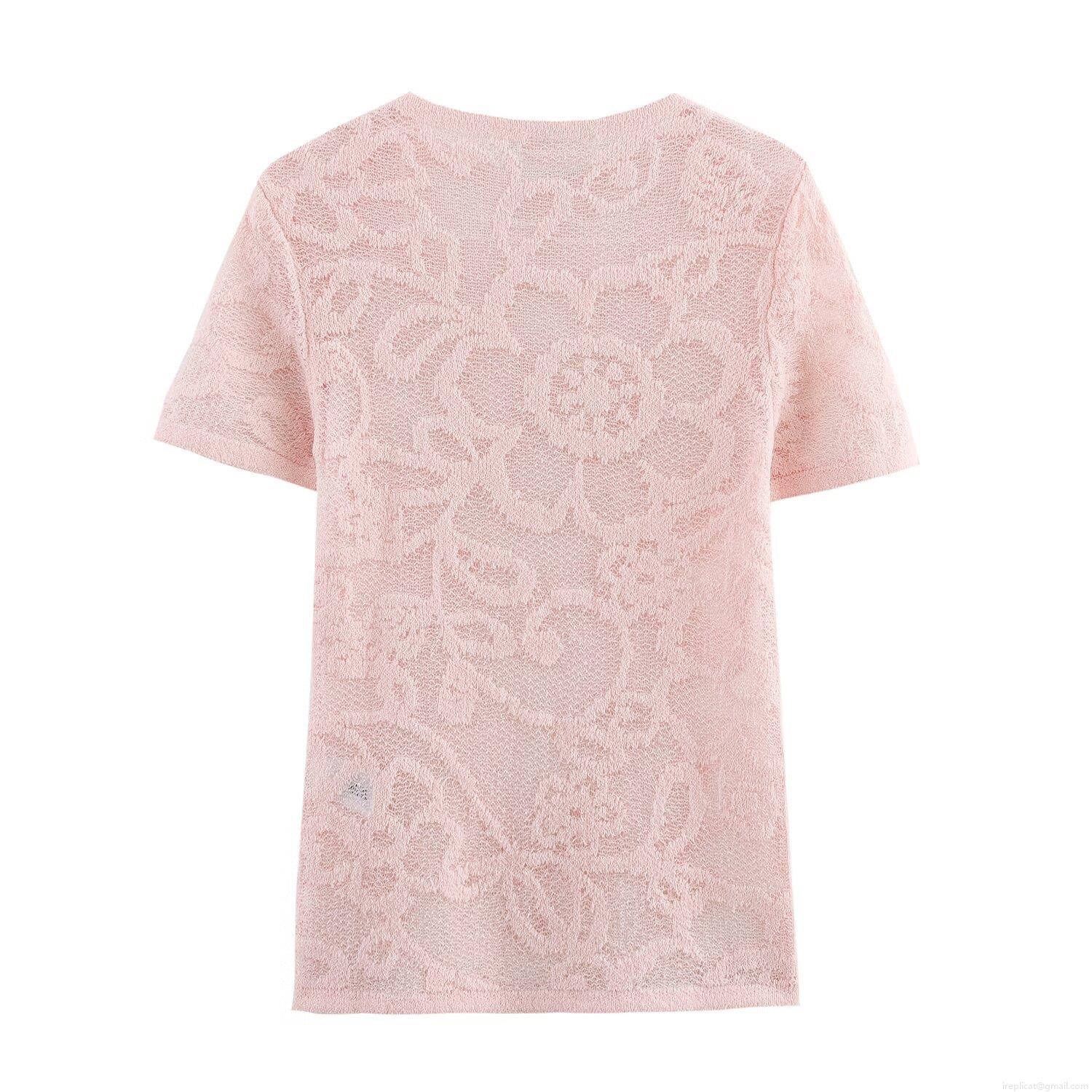 Women's Sweet Lace Floral T-Shirt Elegant Hollow Out Mesh Short Sleeve Round Neck Knit Top Pink Casual Blouse For Summer Ladies