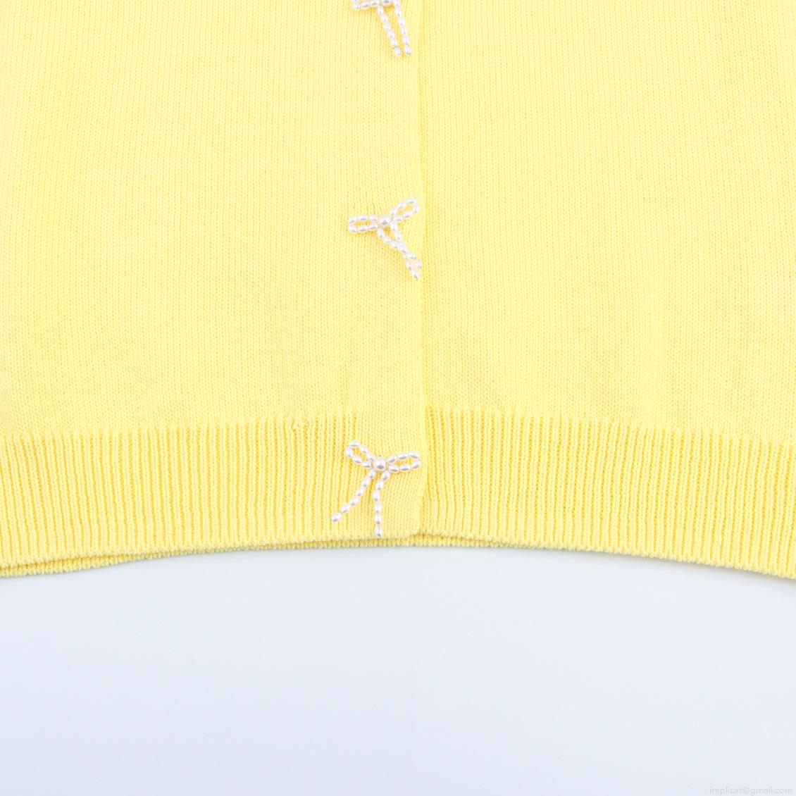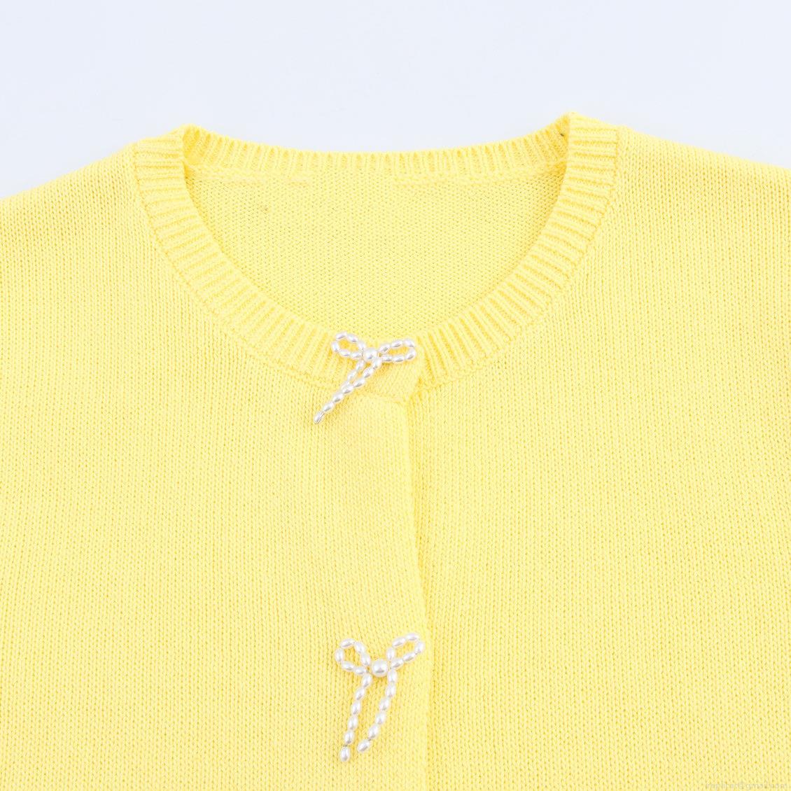 Women's Sweet Short Sleeve Knit Cardigan Top With Artificial Pearl Bow Decoration Round Neck Button Down Summer Casual Knitwear For Ladies
