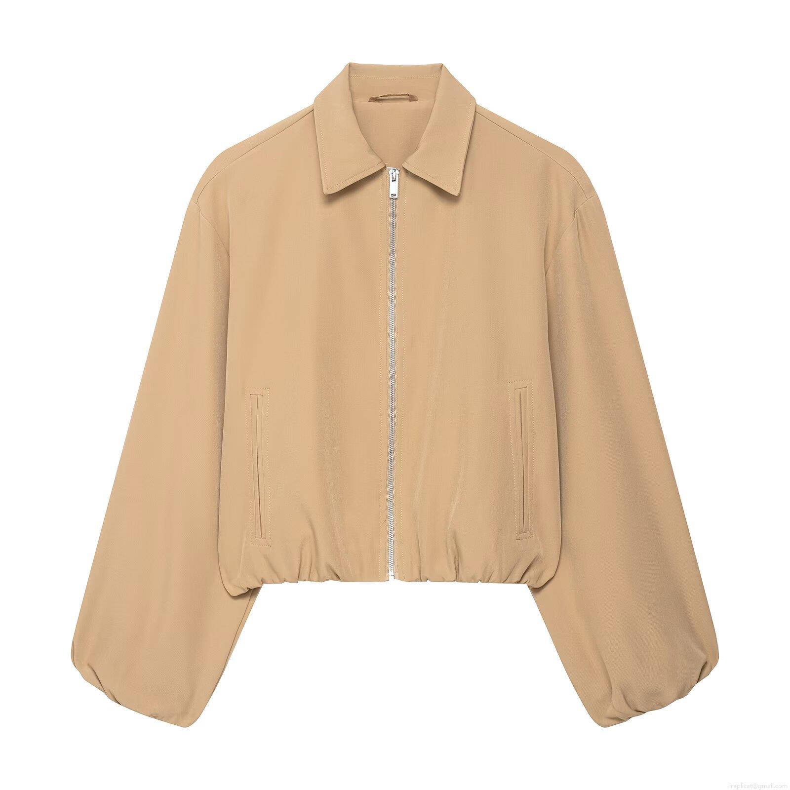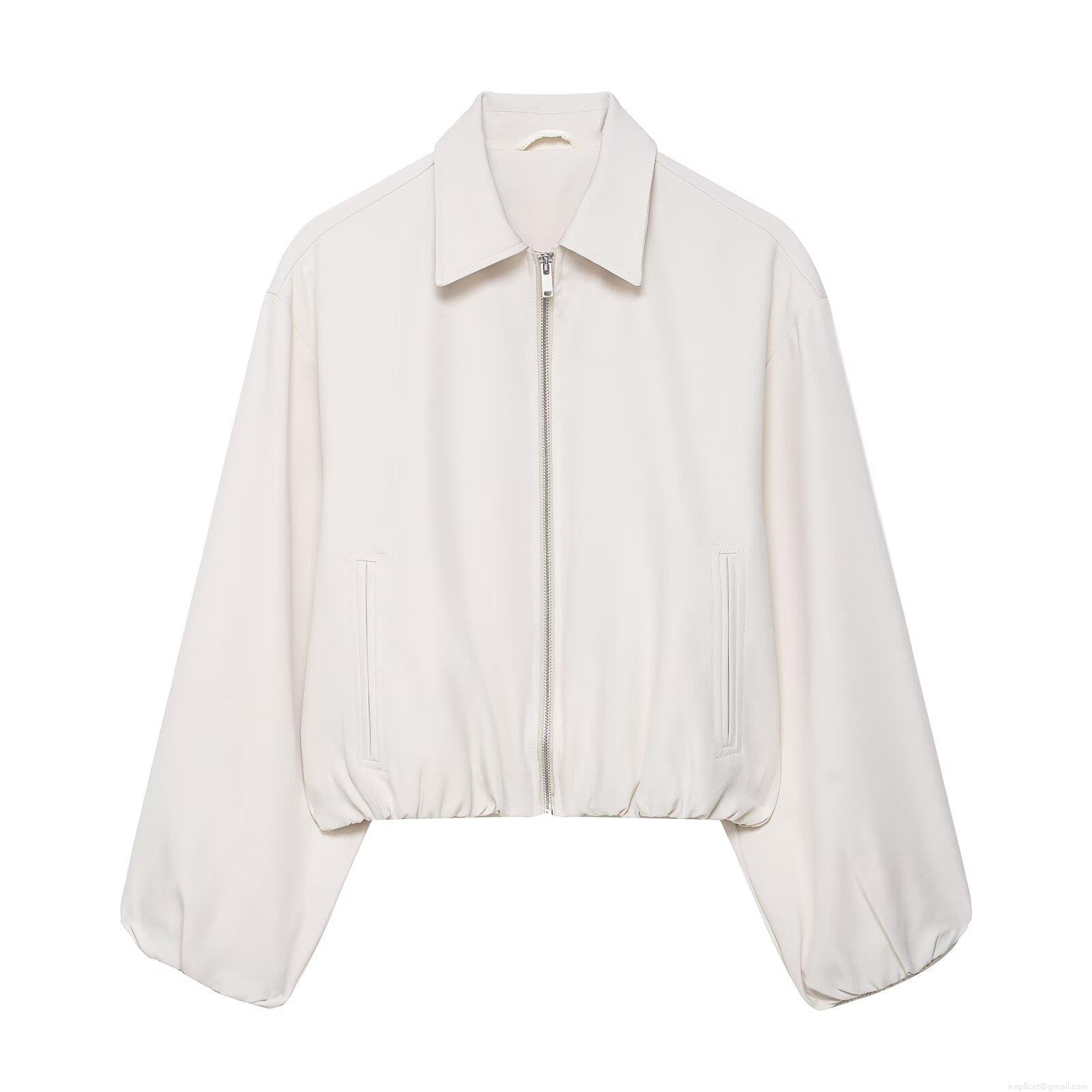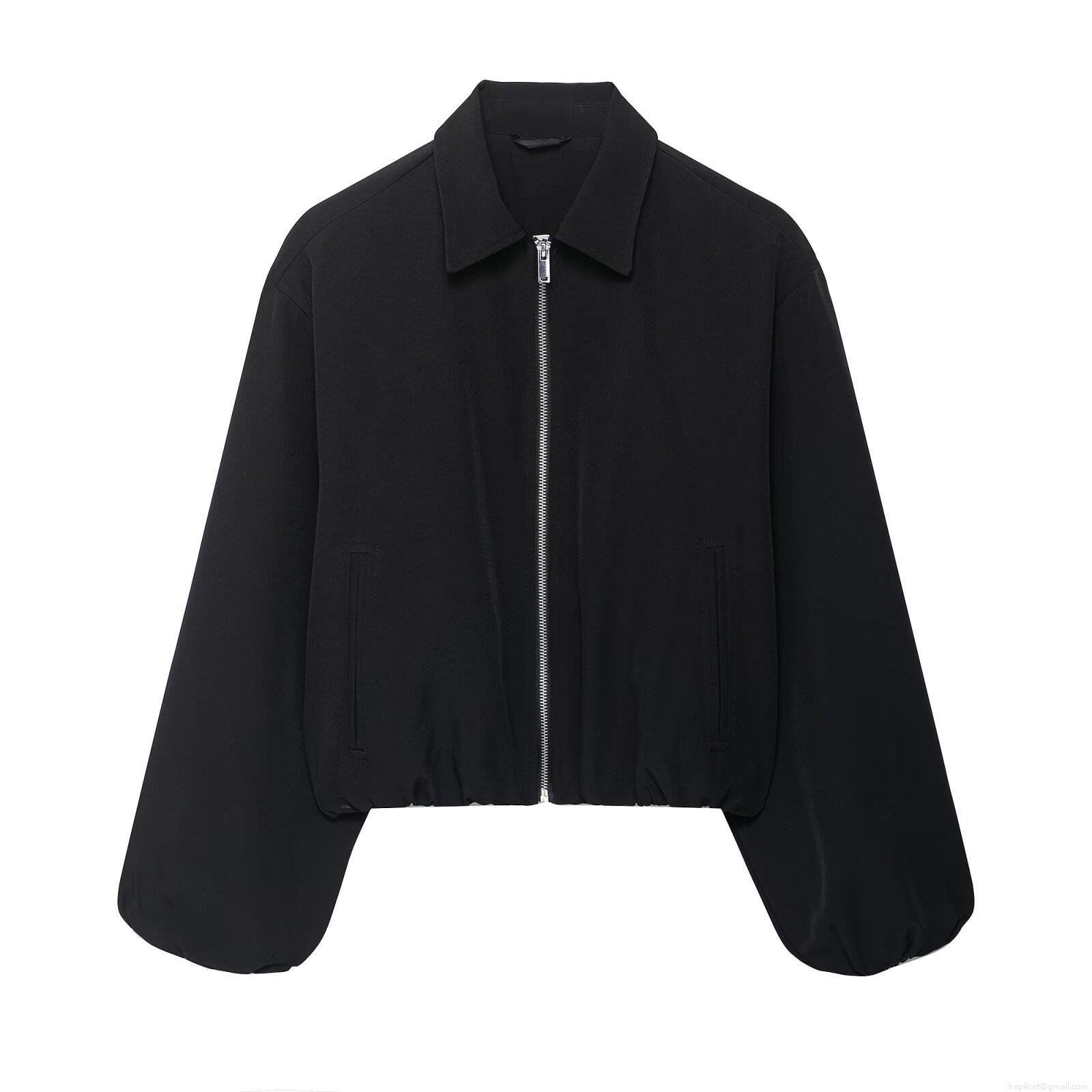 Women's Turn-down Collar Zipper Bomber Jacket Solid Color Balloon Long Sleeve Casual Short Coat Puffed Sleeve Outerwear Polyester Ladies Autumn