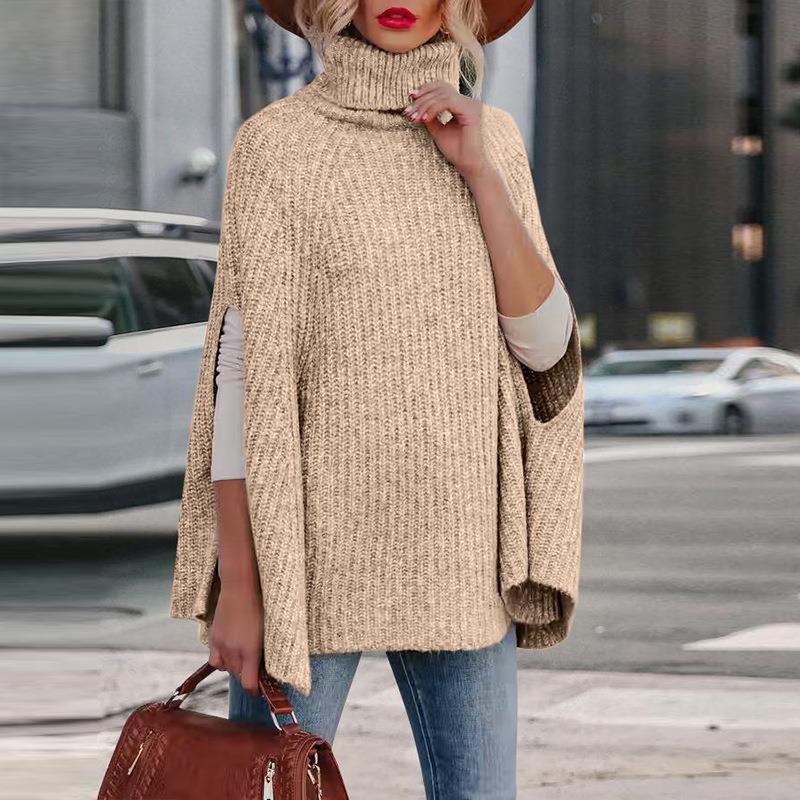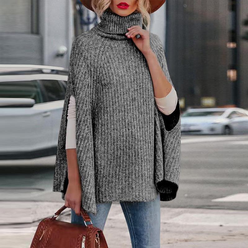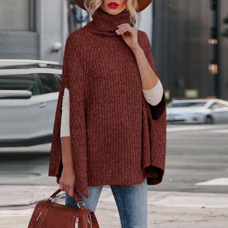 Solid Color, Side Fork, Turtleneck, Chunky Knit, Cloak Cut