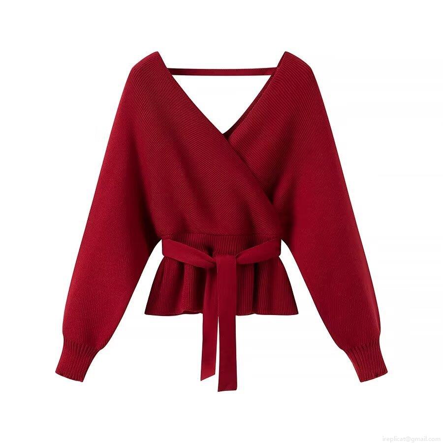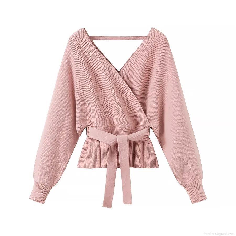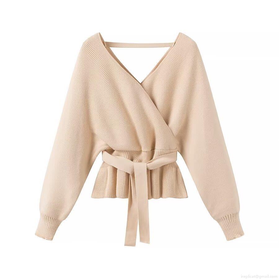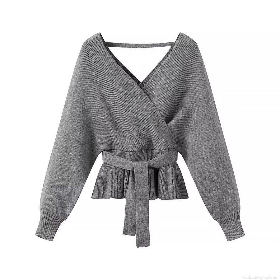 Women's V Neck Cross Wrap Knit Sweater Tie-Up Waist Peplum Hem Long Sleeve Solid Ribbed Cardigan Top For Daily Party Streetwear Fashion Soft Polyester Knitted Pullover