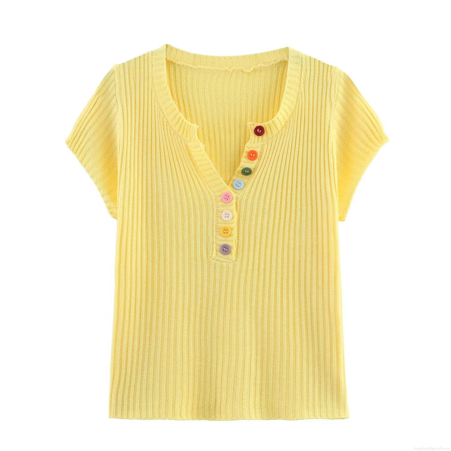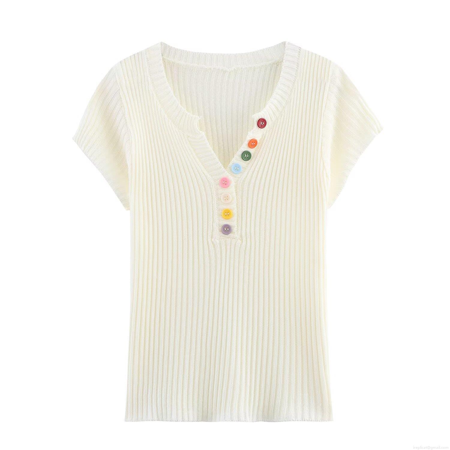 Women's V Neck Knitted T-Shirt Ribbed Short Sleeve Top With Colorful Decorative Buttons Casual Slim Fit Polyester Summer Clothing For Ladies