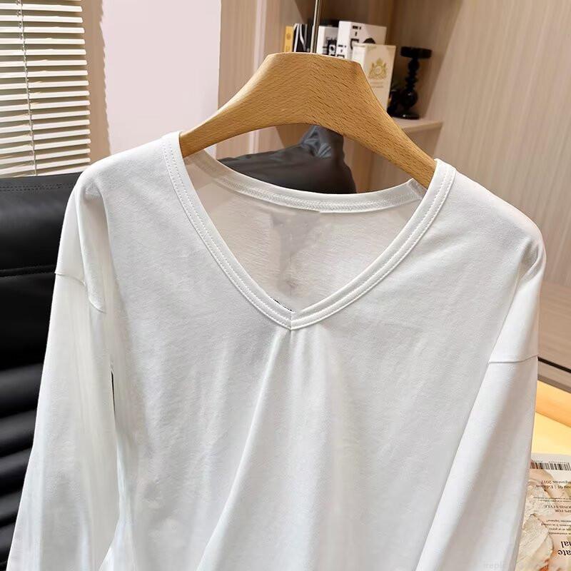 Women's V Neck Long Sleeve T-Shirt 95% Cotton 5% Spandex Knit Pullover Loose Fit Casual Minimalist Daily Basic Tee Top For Autumn Winter