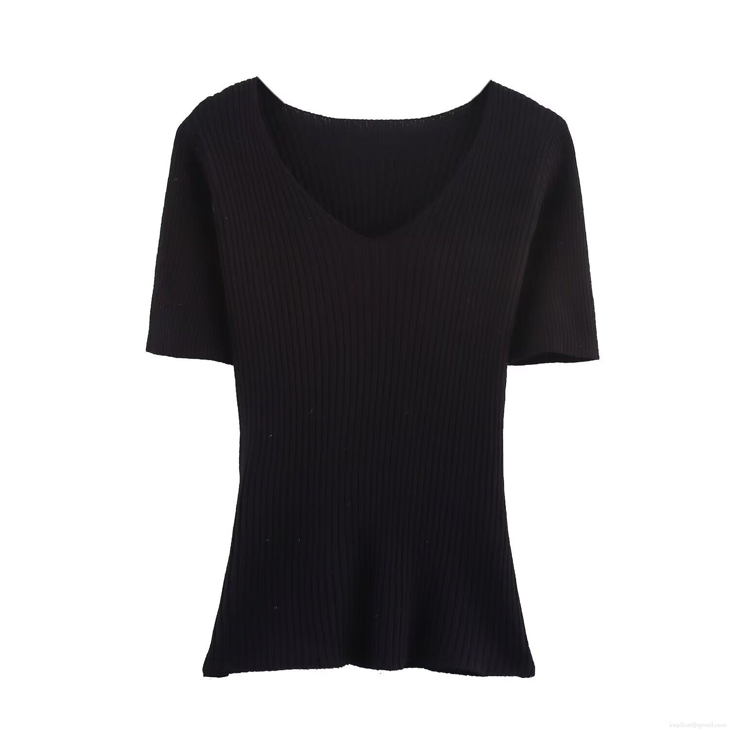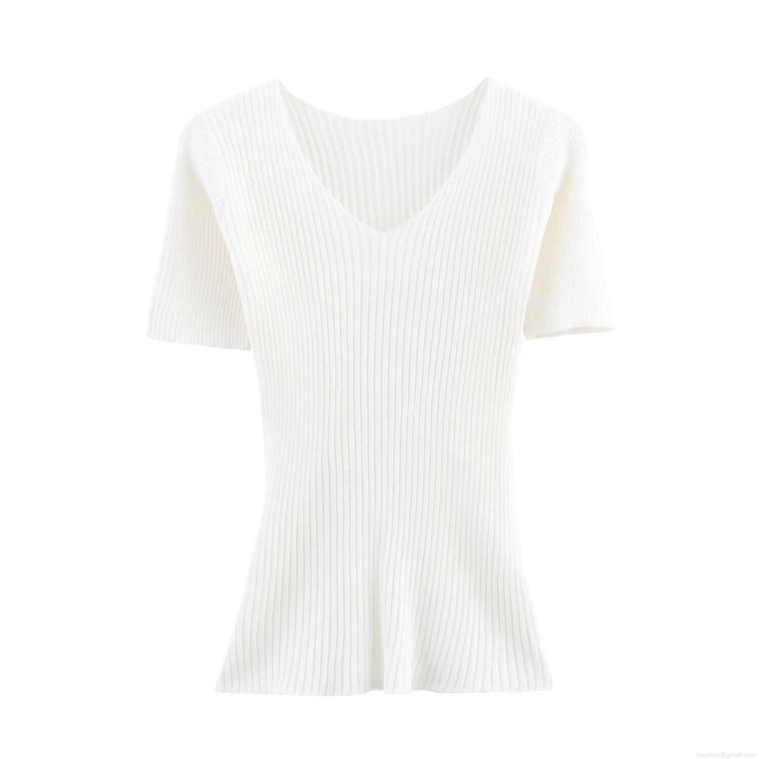 Women's V Neck Short Sleeve Ribbed Knit T-Shirt Slim Fit Solid Color Polyester Summer Casual Basic Tee Top For Daily Wear