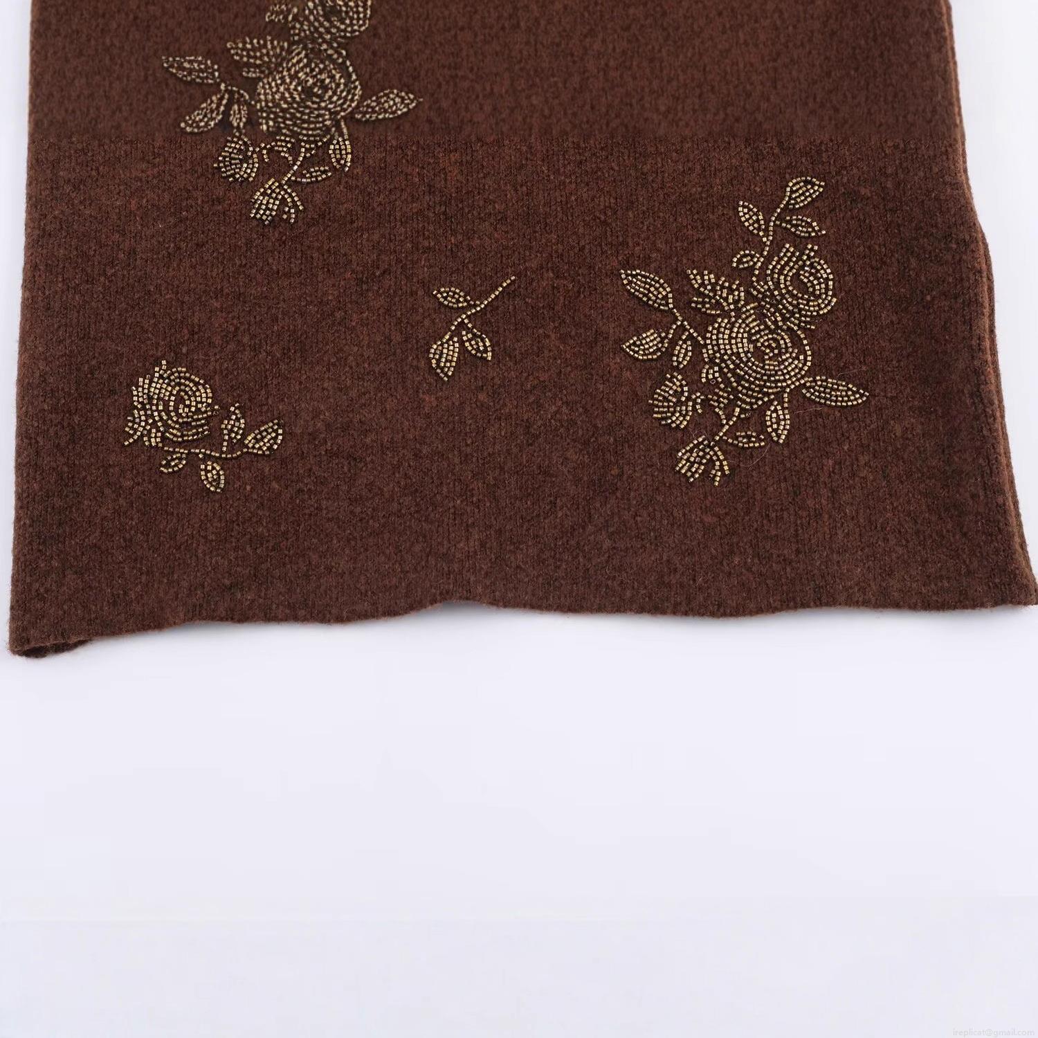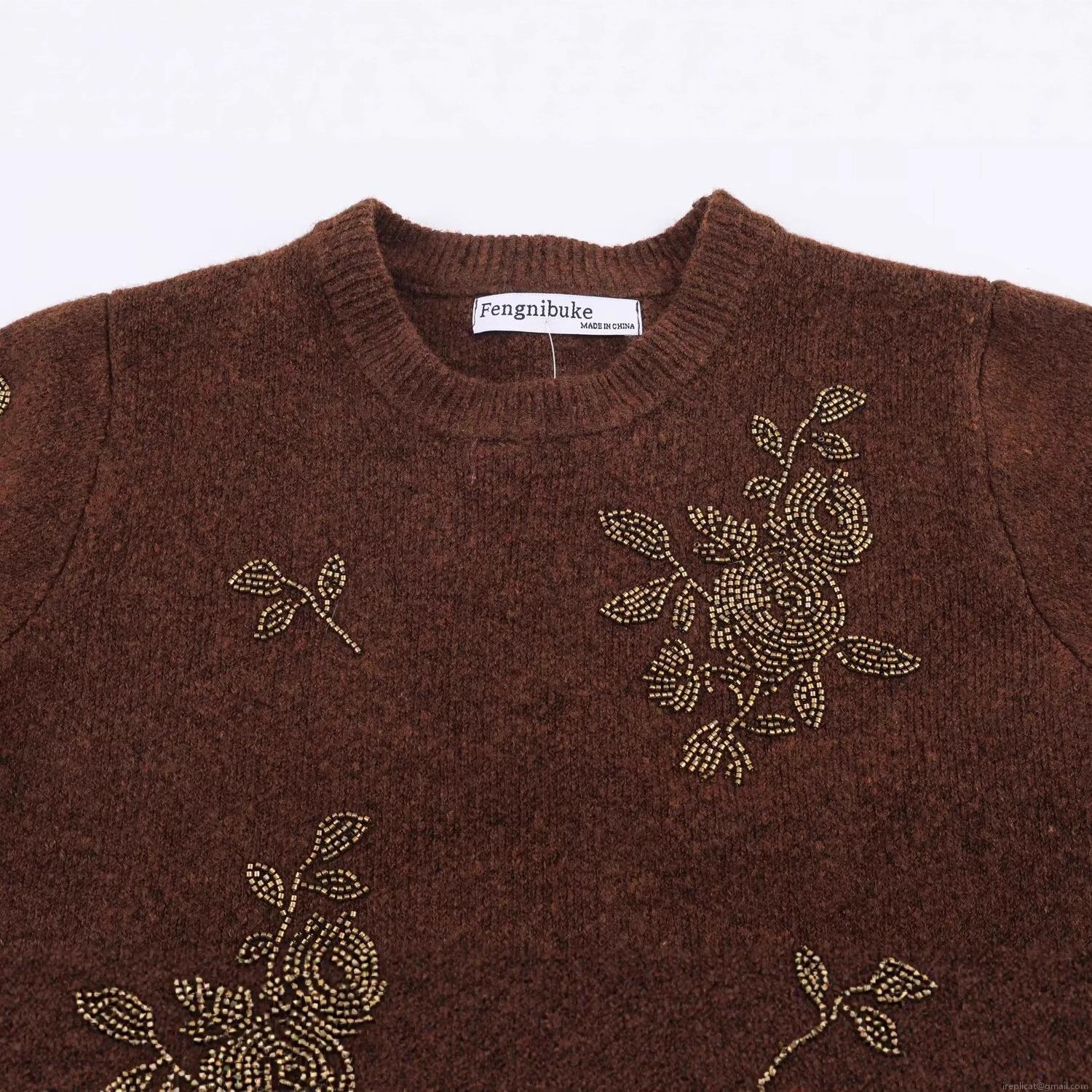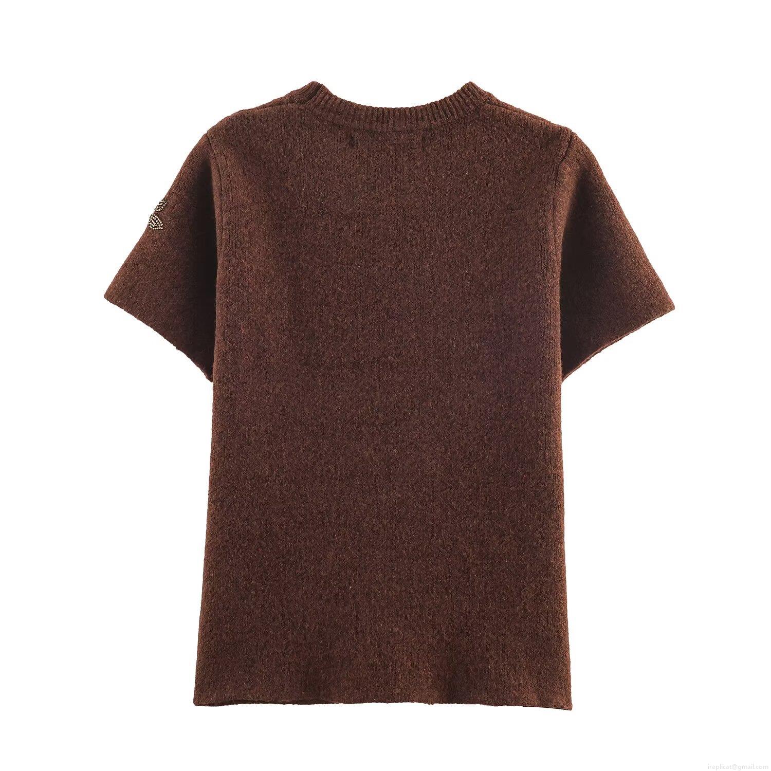 Women's Vintage Dark Brown Round Neck Short Sleeve Knit Sweater Beaded Flower Embroidery Acrylic Polyester Blend Elegant Streetwear Top For Women