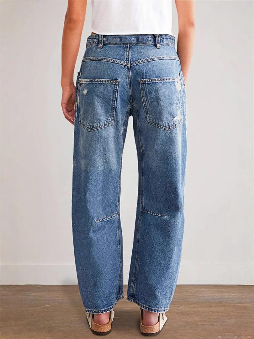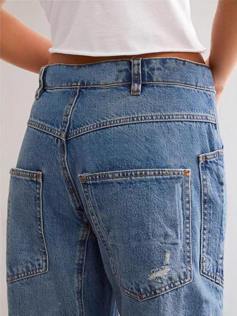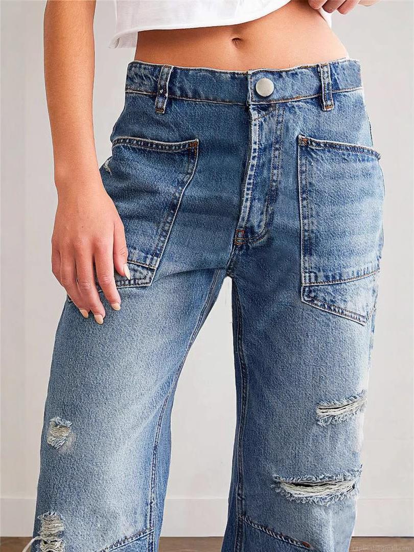 Women's Vintage Distressed Straight Leg Jeans Cotton Denim Ripped Patchwork Loose Fit Casual Long Pants With Big Pockets Streetwear Fashion