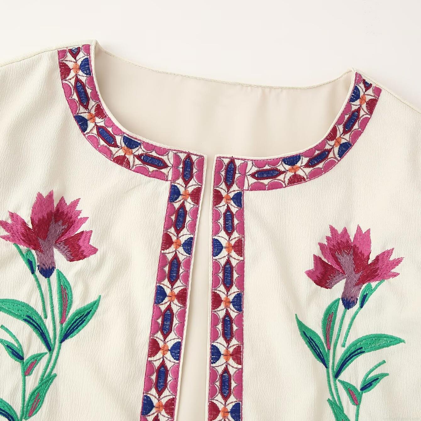 Women's Vintage Embroidered Short Jacket 100% Polyester Long Sleeve Round Neck Outwear Bohemian Floral Pattern Single Breasted Cardigan Coat For Autumn Winter Fashion