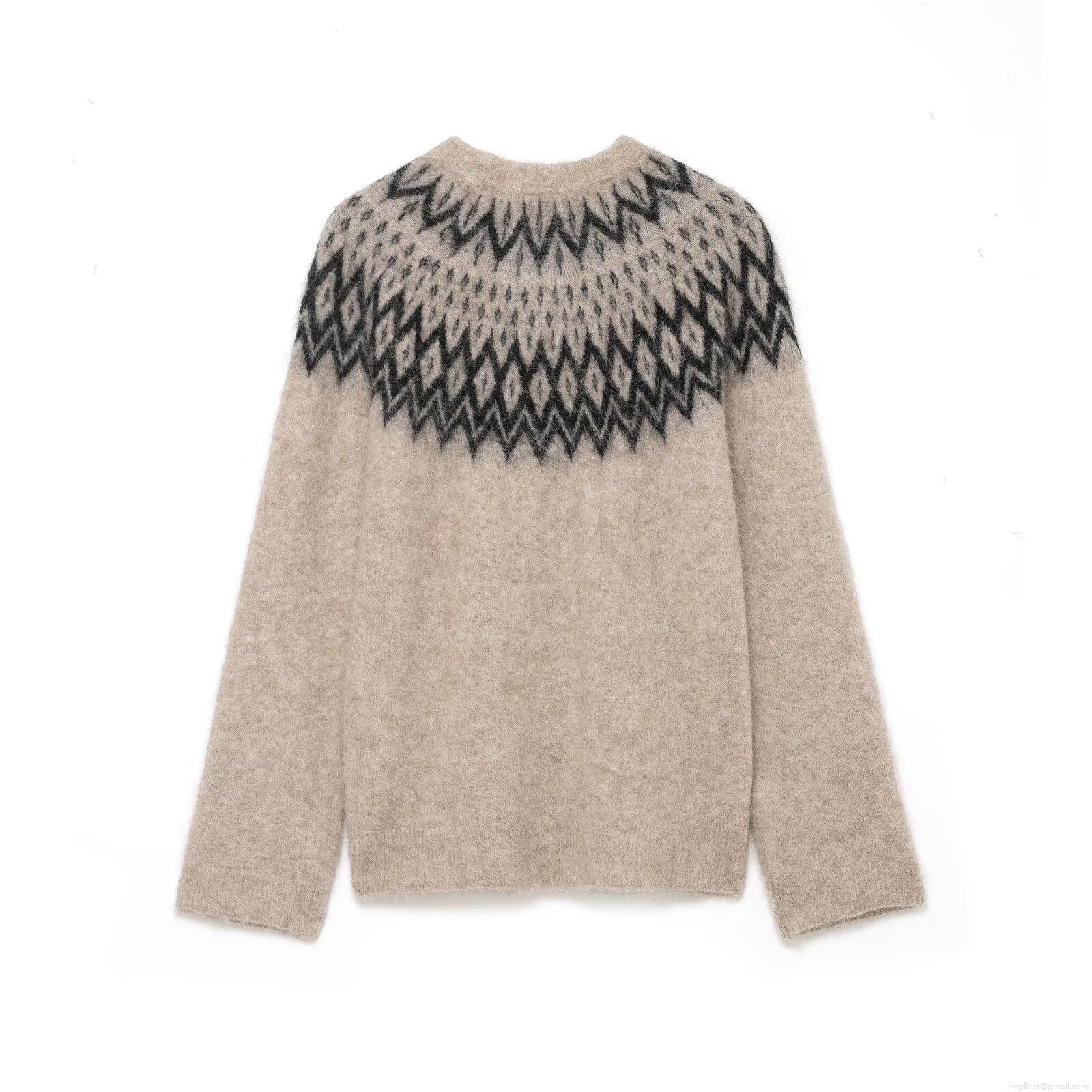 Women's Round Neck Long Sleeve Geometric Jacquard Knit Sweater Retro...