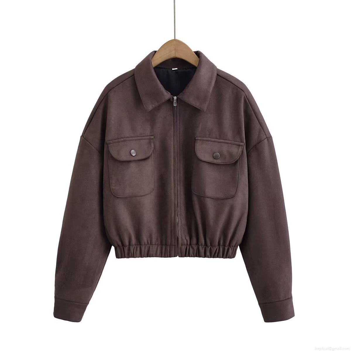 Women's Vintage Faux Suede Jacket Casual Zipped Front Lapel Collar Coat With Cargo Pockets Elastic Hem Long Sleeve Retro Streetwear Outerwear For Women