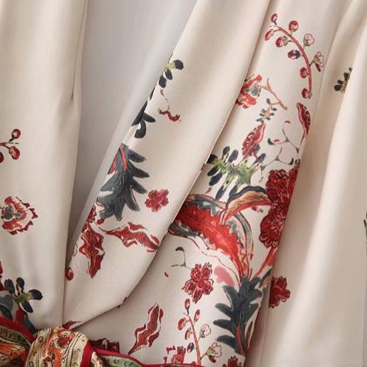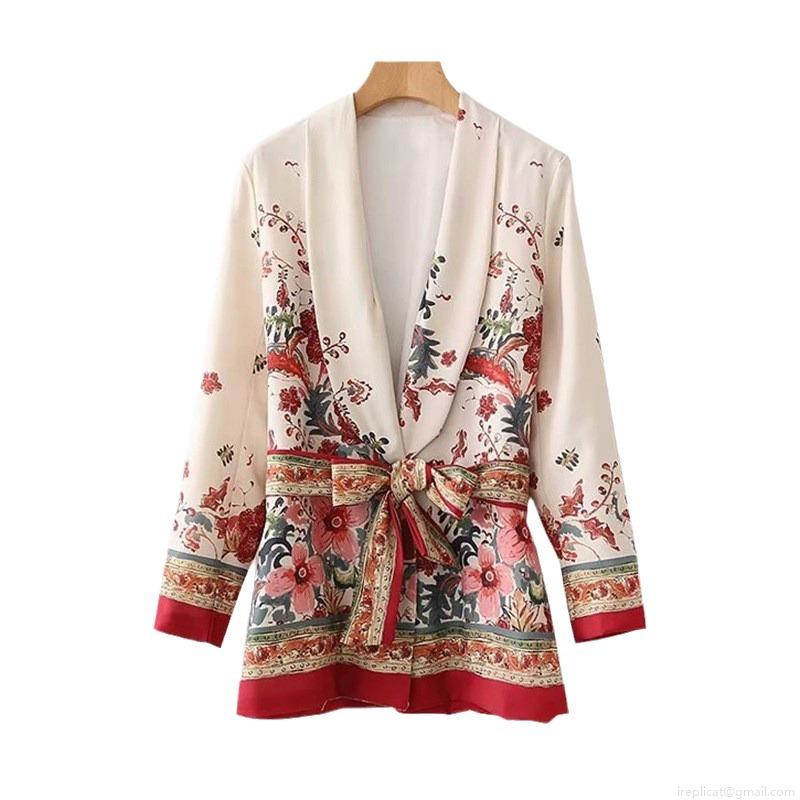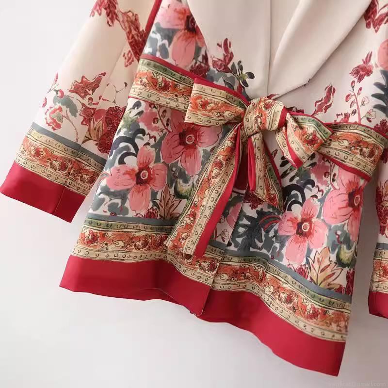 Women's Vintage Floral Print Blazer Jacket Long Sleeve V-Neck Cotton Blend Cardigan With Waist Tie Belt Elegant Casual Outerwear For Women